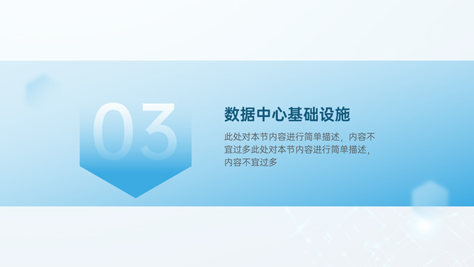简介:数据中心工作内容介绍通用ppt模板,本模板共11页,颜色:青蓝色,风格:清新简洁,包括封面、目录、过渡页及工作内容介绍常见内容页,所有内容均可编辑,造型简约,版式丰富,字体可一键替换,颜色可一键更改,图片可更换,在日常使用时,可多页复制,满足客户需求,只需稍加改动即可完成工作介绍、汇报ppt的制作,P界达人 daaa白 作品。