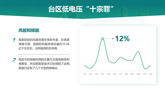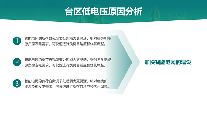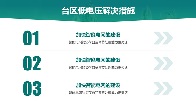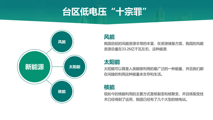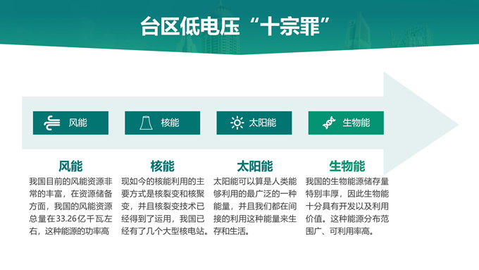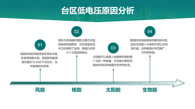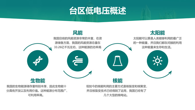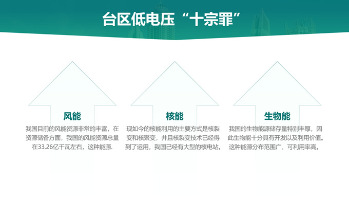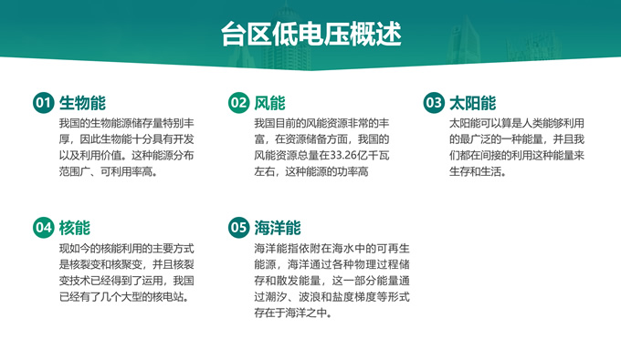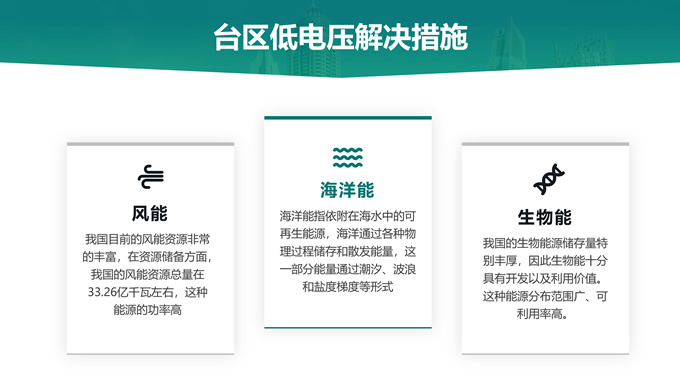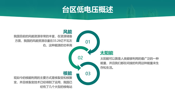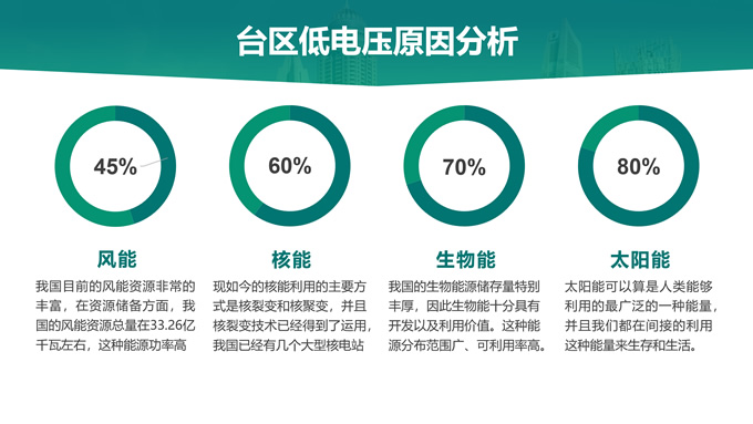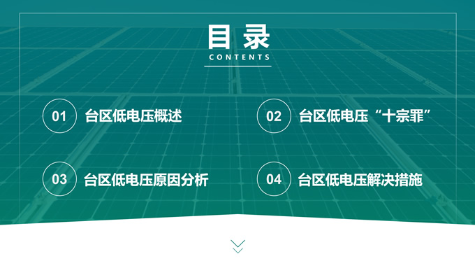 简介:绿色电力技能竞赛ppt模板,本模板共22P,主要内容为低电压台区原因分析及解决措施,目录:台区低电压概述、台区低电压“十宗罪”、台区低电压原因分析、台区低电压解决措施,天阳能电池板大图背景,极简几何风创意封面、目录页、过渡页,环保绿配色,简约扁平化图表完整框架内容页,适合技能竞赛演讲、项目汇报、工作汇报等场景应用的电力通用ppt模板。