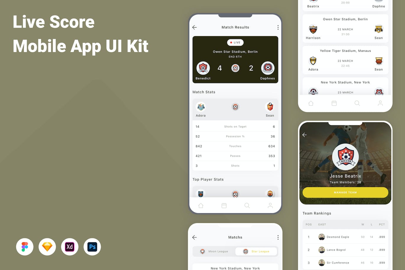 Live Score移动应用程序UI套件采用现代设计趋势设计。