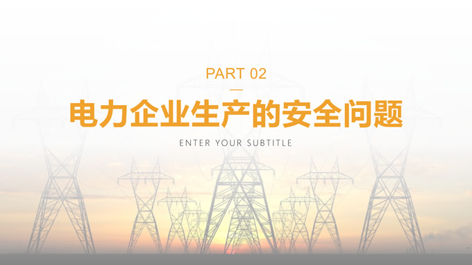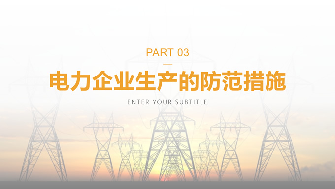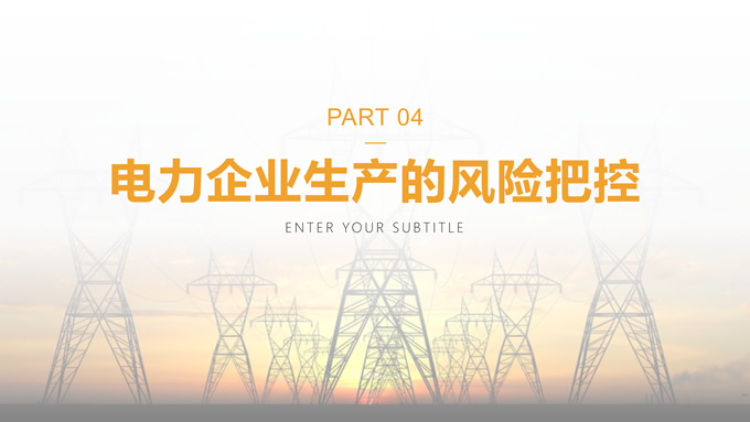 简介:黄色简约电力安全生产培训ppt模板,本模板共22P,目录:电力企业安全生产的概念、电力企业生产的安全问题、电力企业生产的防范措施、电力企业生产的风险把控,电力安全装备主图,极简约封面、目录页、过渡页,黄色警戒色配色,扁平化图表,电力素材配图简约版式内容页,适合电力安全生产培训,电力项目汇报等场景应用的电力行业通用ppt模板。