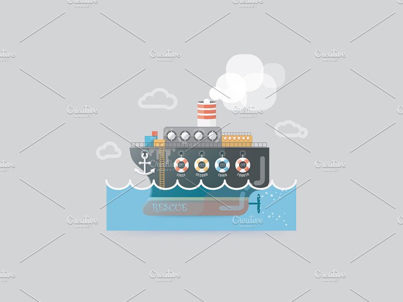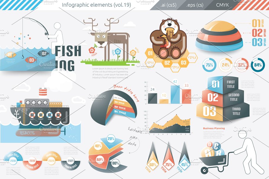 - 鹿,钓鱼,救援和打捞船,人和车轮桶和熊抽象信息图表模板