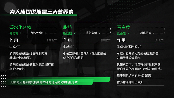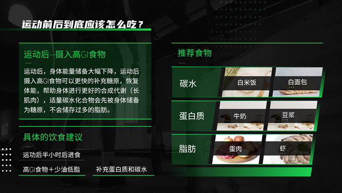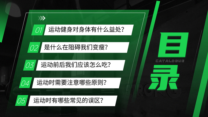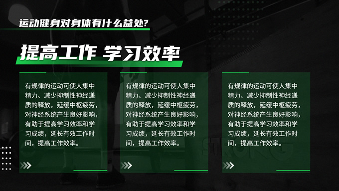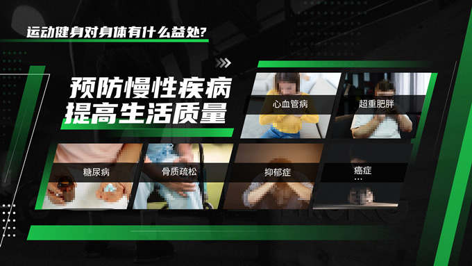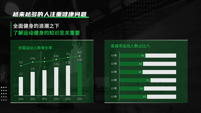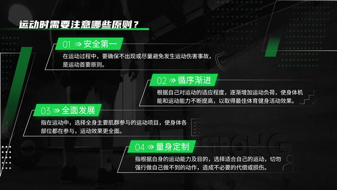 简介:黑绿色运动健身知识科普ppt模板,本模板共30P,黑绿配色搭配活力几何,动感十足,涵盖多段内容页、多段图文页、数据图表页、多图页等多种版式,适用于讲座分享、运动相关主题课件、运动行业工作汇报等场景,P界达人 Yuki 作品。