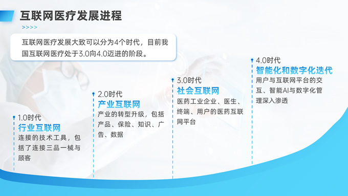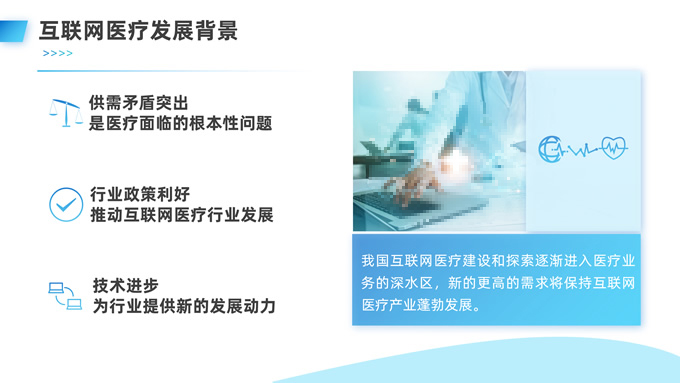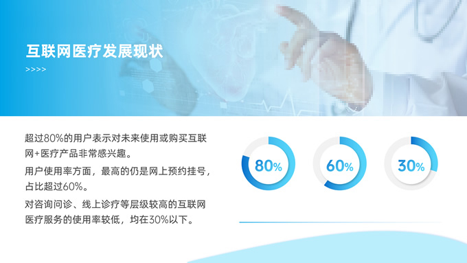 简介:互联网医疗发展现状与趋势医疗项目汇报ppt模板,共有30页,模板以互联网医疗项目为例,内容包括项目背景、项目发展进程、项目发展成果、项目发展趋势,配色以蓝色为主,配色清新,版式丰富、元素均可编辑,使用简便、高效,P界达人 叽叽 作品。