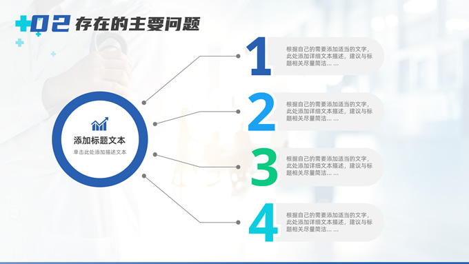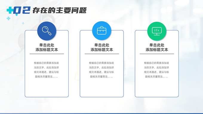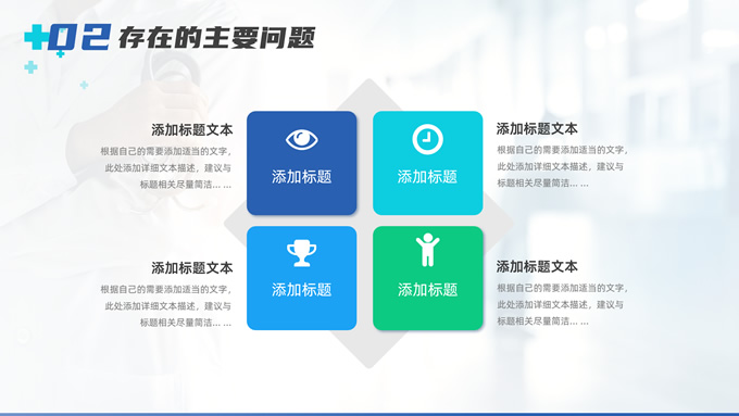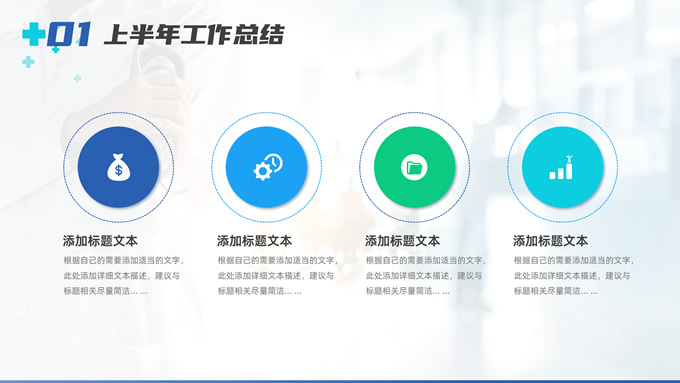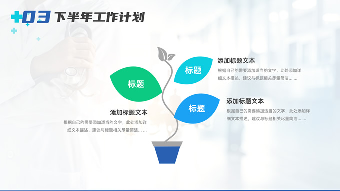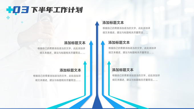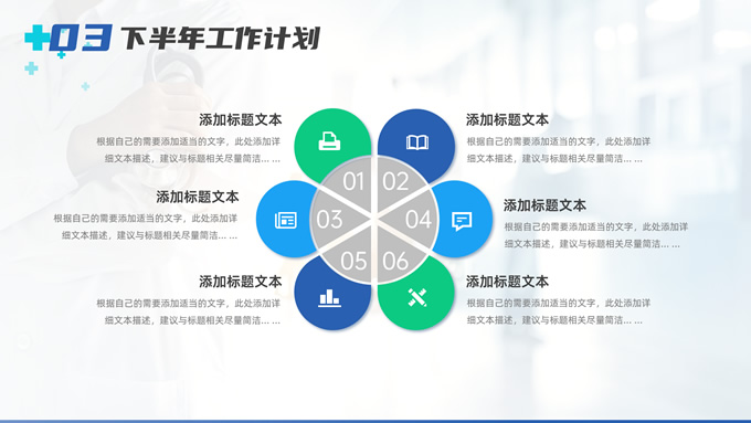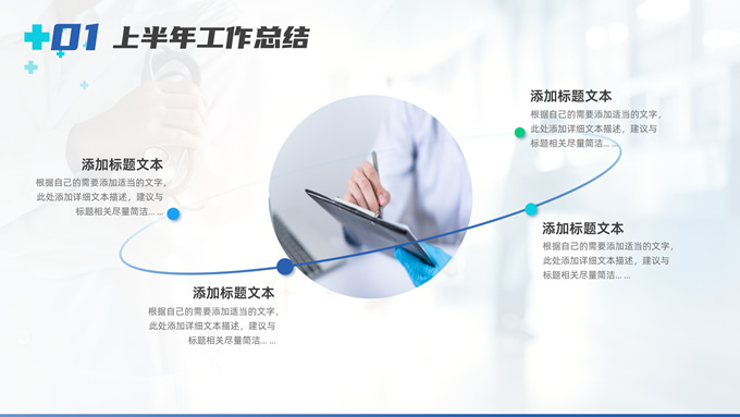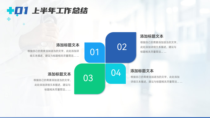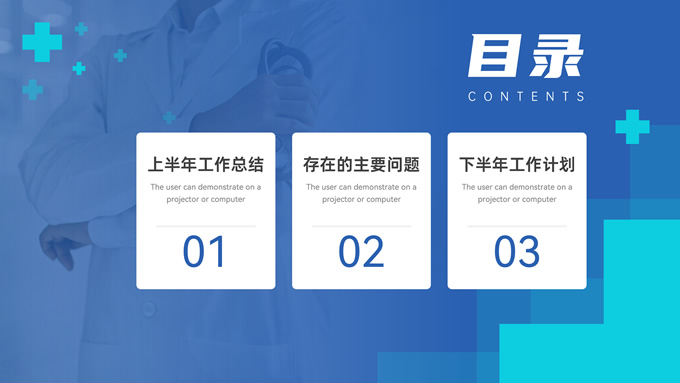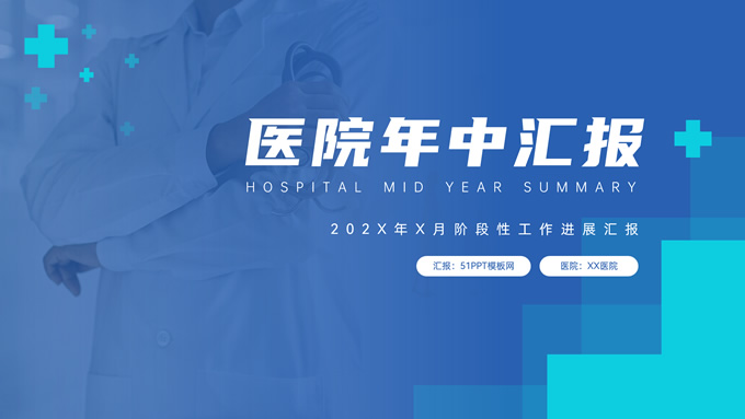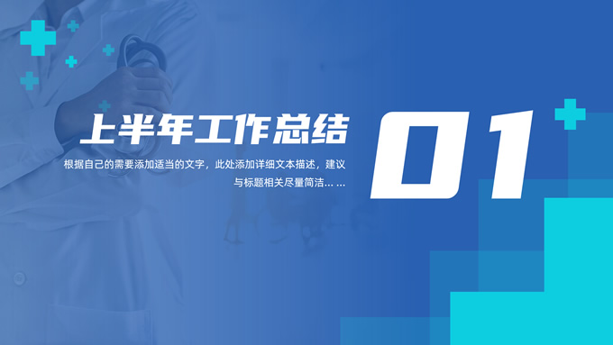 简介:医院年中阶段性工作汇报ppt模板,本模板共18P,目录:上半年工作总结、存在的主要问题、下半年工作计划,渐变蓝蒙版医生大图背景,十字几何风标题文字封面,蓝绿清新风配色,医疗相关图片配图简约版式内容页,适合医院年中汇报、医务工作者总结汇报等场景应用的医疗行业通用ppt模板。