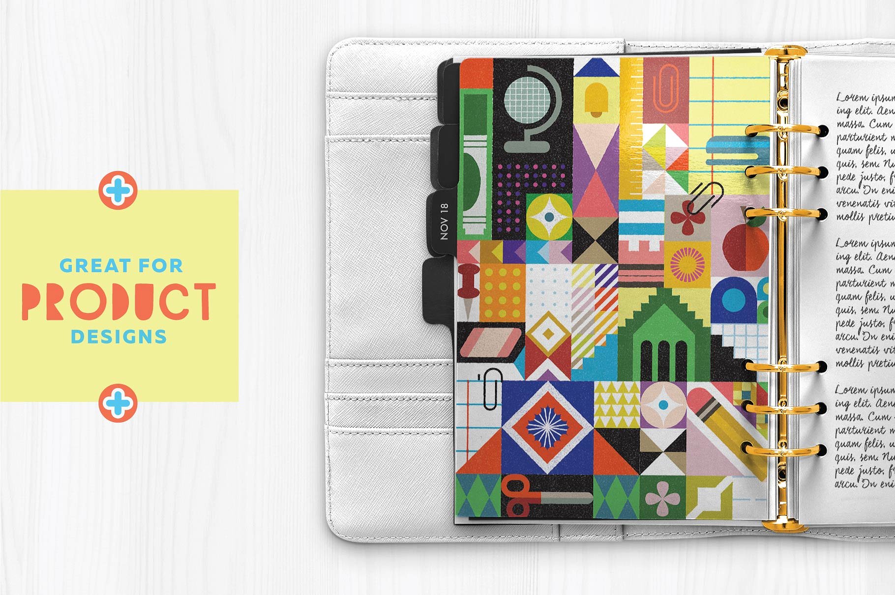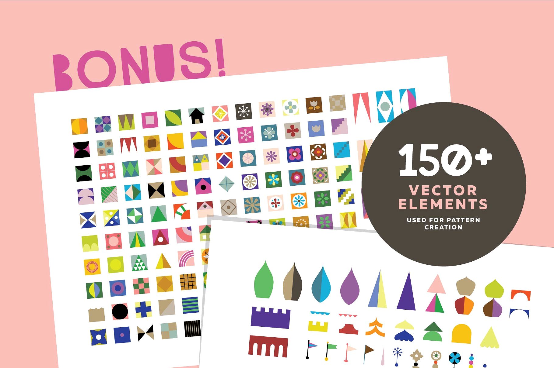 这组明亮多彩的几何图案合集包括了10个彩色背景,20个图案加上超过150个额外的元素,可用于创建图案,使您的设计很容易合并那些额外的元素!