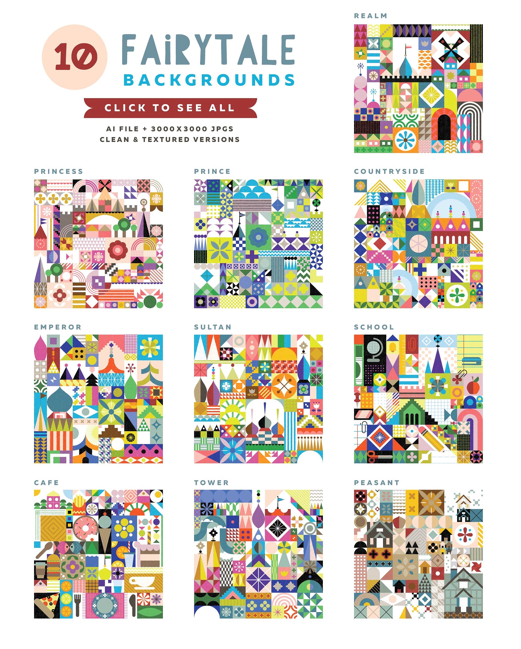 这些图案包含抽象元素,包括城堡、房屋、食物、学校用品、自然元素、花朵和几何图形。它们将是用于儿童产品,故事书插图和其他更多项目的理想元素!