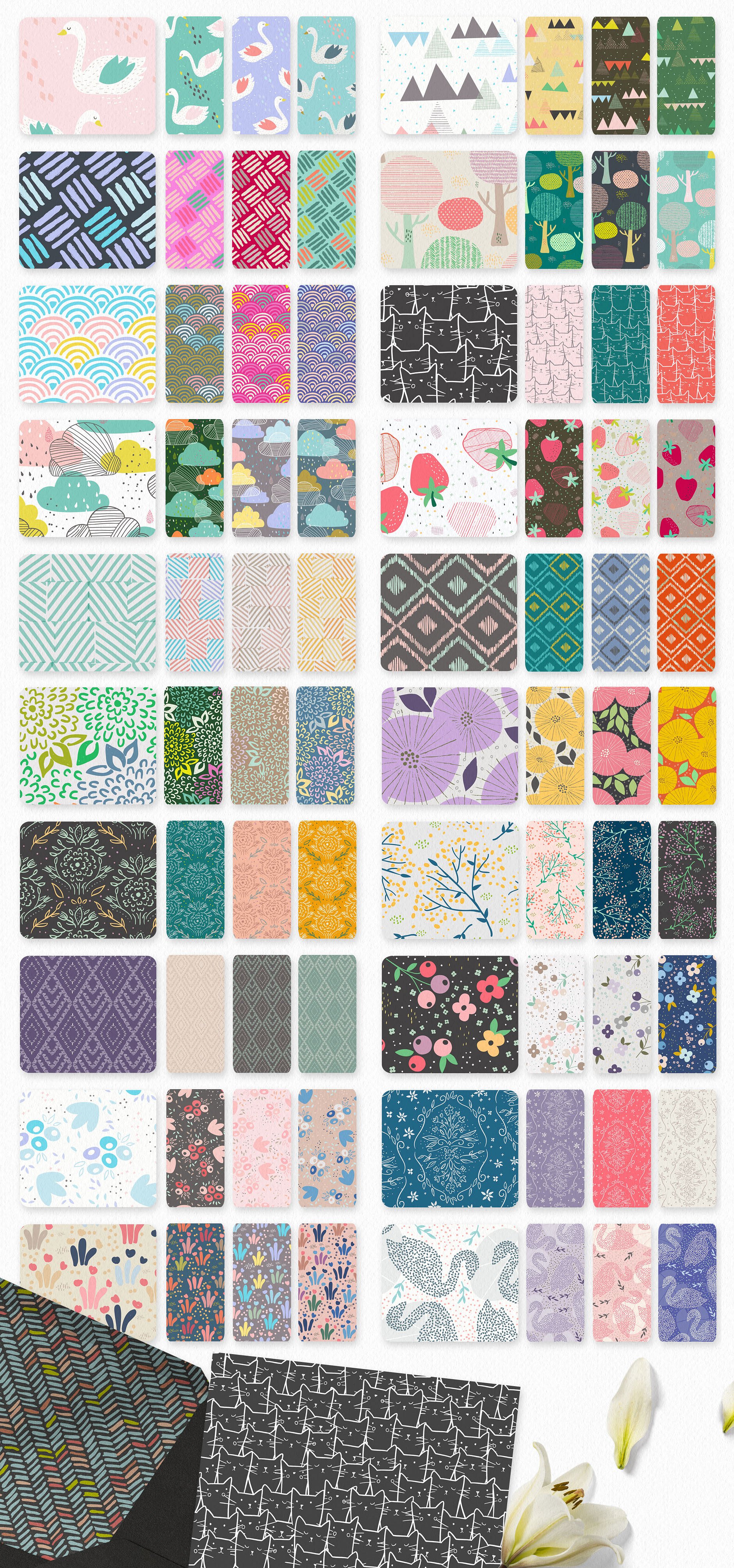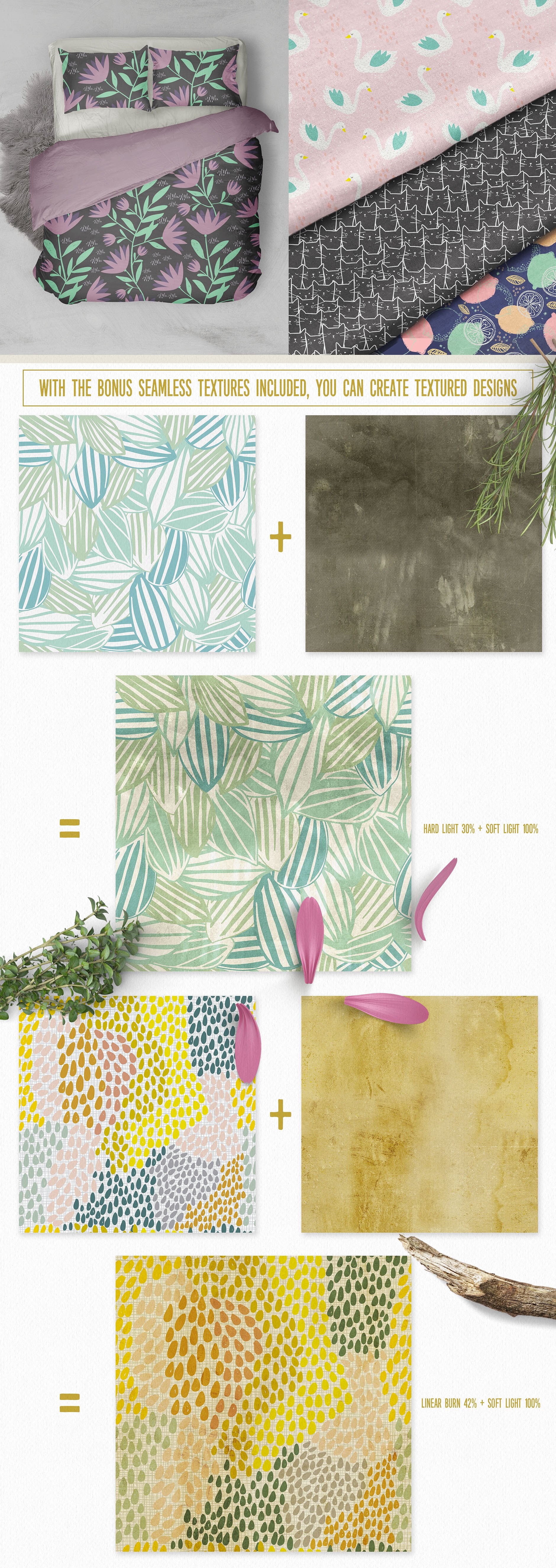 每个图案有4种不同的颜色方式,已保存为单独的png文件,以便您可以轻松地改变颜色。有了额外的纹理,您可以设计自己的纹理图案!