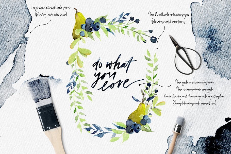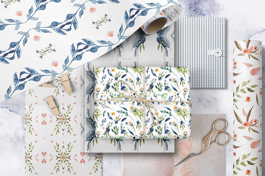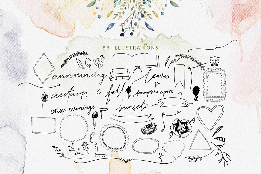 这组巨大的包裹里装满了漂亮的手绘水彩画图形和图案,包括215个元素,21个预先设计的元素,56幅插图,17幅图案。