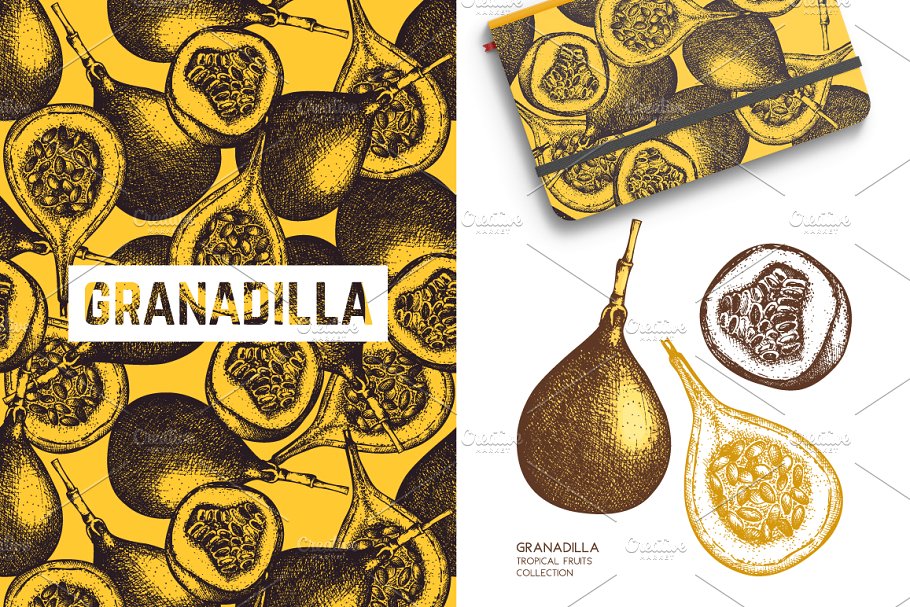 - 4个EPS文件+ 4个JPG文件- 4个带有热带水果的矢量设计图案。