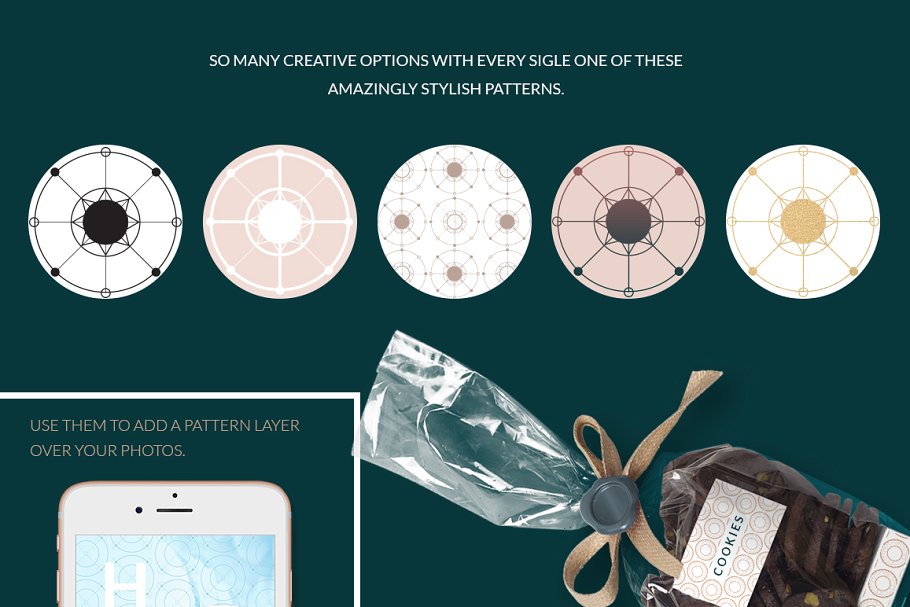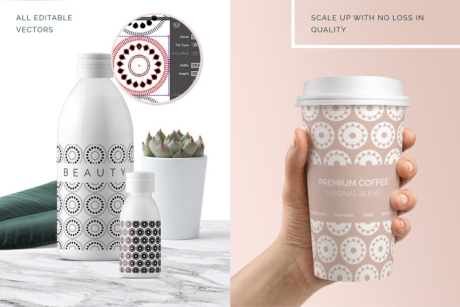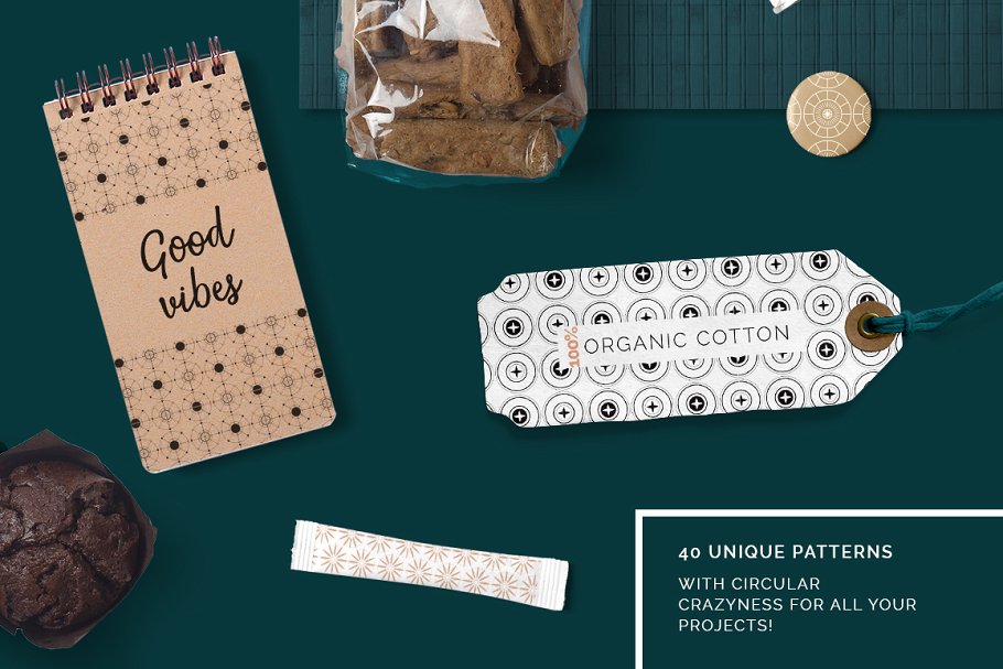 这组纹理合集包括了可编辑的几何元素和40个圆形无缝矢量图案。