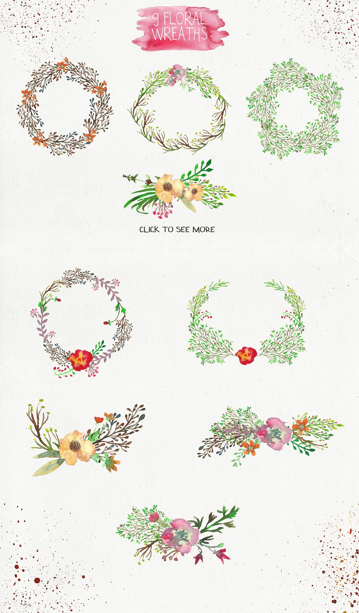 花卉设计元素,溅泼和水彩形式为您的设计增加深度。您可以得到预先制作的商标模板,花环和花束,无缝的图案与一个主文件和一些卡片模板。