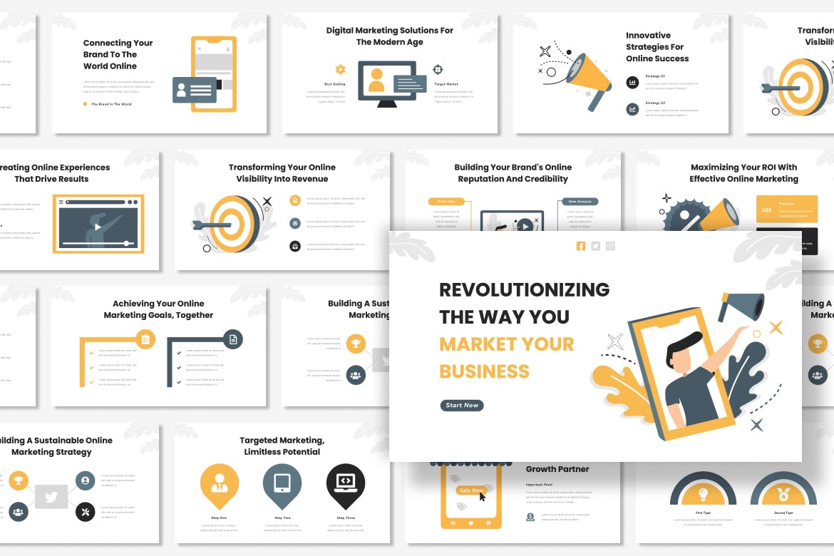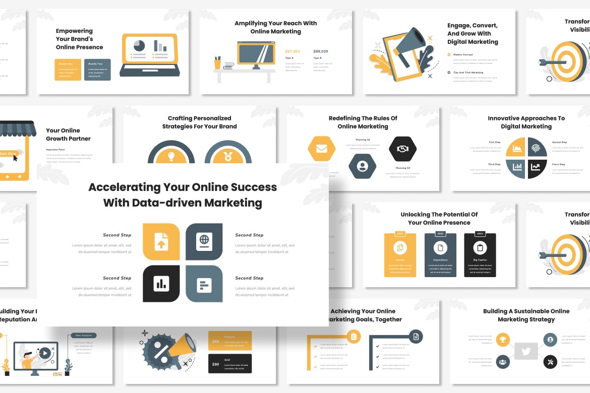 网络营销信息图主题演讲模板,此项目包含 20 张独特的幻灯片,具有令人惊叹的色彩以及广泛接受的功能。让您的演示文稿看起来很专业。现在打动你的客户。
