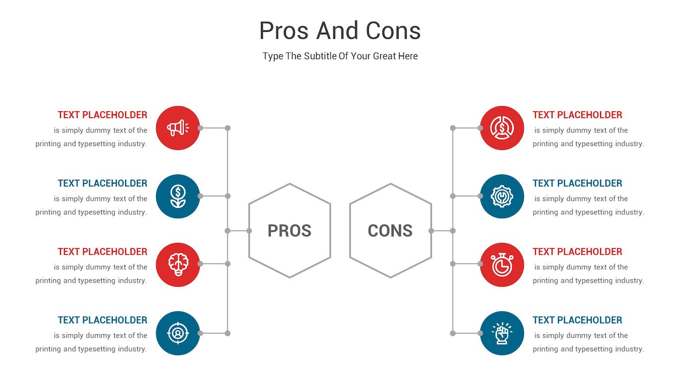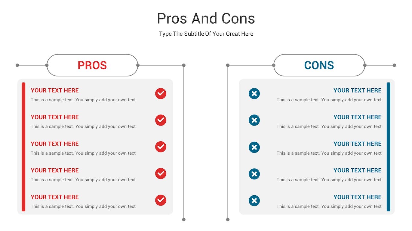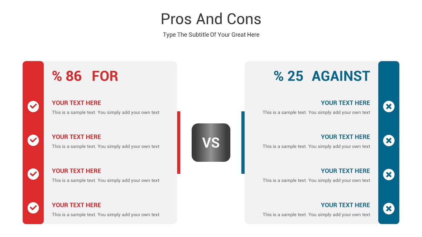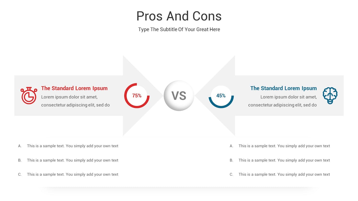 比较优缺点Keynote幻灯片设计模板使您可以轻松地展示您对项目的想法,以简单轻松地了解您的周围环境。您可以轻松编辑和填写您的个​​人内容,所有对象都是矢量对象,并且它们是完全可编辑的,所有使用的图标都是智能对象和矢量,这意味着您可以轻松更改它们尺寸和颜色到任何你想要的尺寸,而不会失去分辨率。