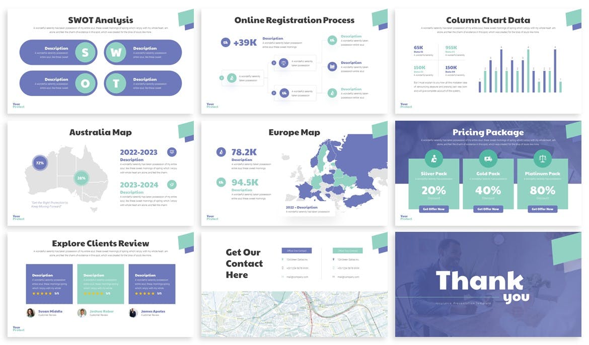这是一个大胆而简单的 Keynote 模板,在这里我们使用保险业务作为预览/主题。但是,您可以出于其他目的使用任何您想要的内容对其进行编辑。例如,这适用于商业计划、公司简介、投资组合等,所有元素都可以从形状到颜色进行编辑。您不需要其他软件来编辑它,只需使用 Keynote。