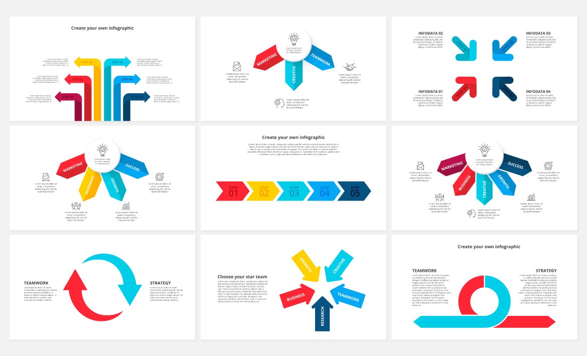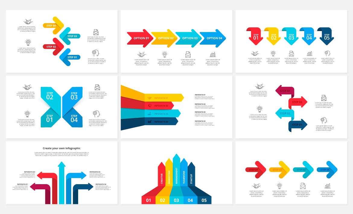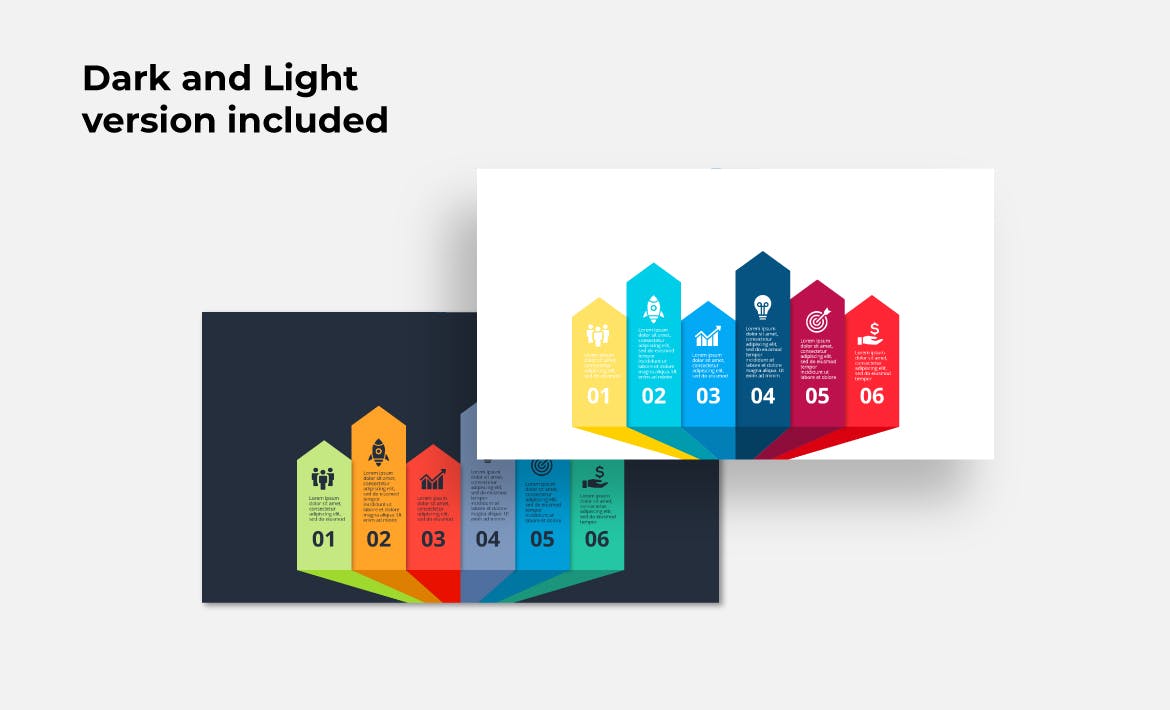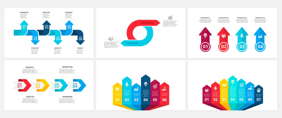业务数据可视化。流程图。图形的箭头元素,具有 2、3、4、5 和 6 个步骤、选项、部分或过程的图表。用于演示文稿的主题演讲业务模板。图表的创意概念。