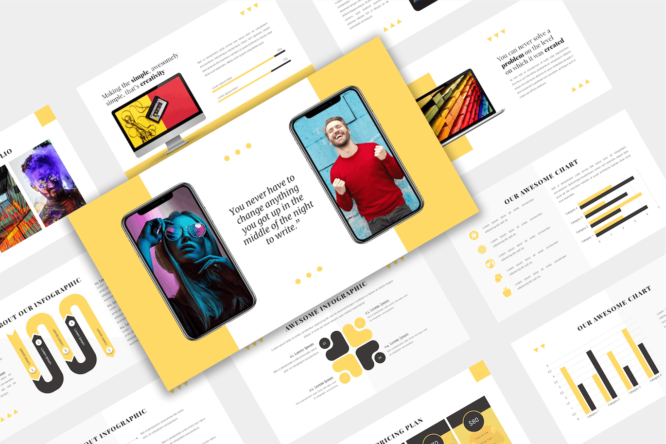 可用于任何类型目的的创意主题演讲模板,例如:社会代理、营销、金融、摄影、项目、品牌、投资组合、初创公司和个人。这里提供多种布局,现代、干净、创意、高端、易用。