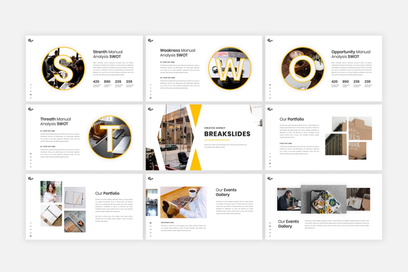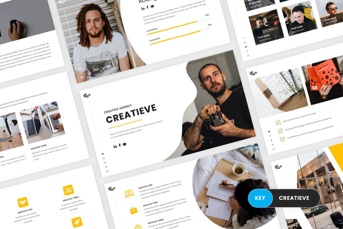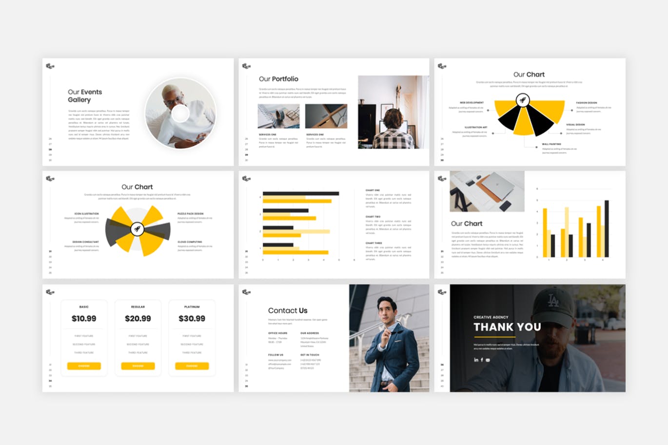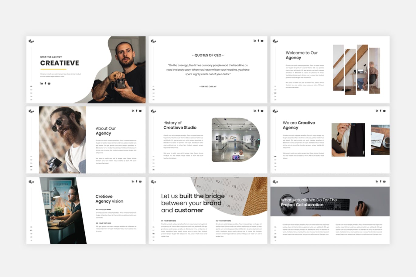 创意摄影工作室介绍幻灯片模板每张幻灯片都是独特的,不仅仅是重复的布局。只需使用此幻灯片,您就可以为您的品牌创建华丽的广告演示,它是数字媒体工具包、营销工具包或演示文稿的完美选择。