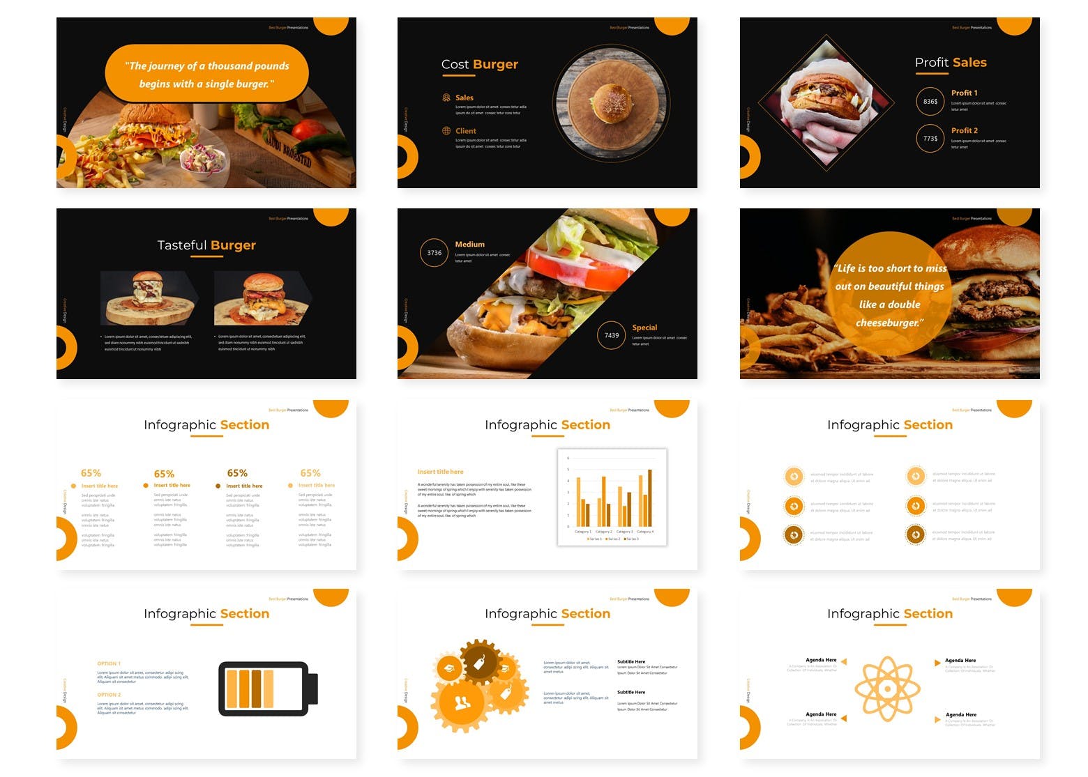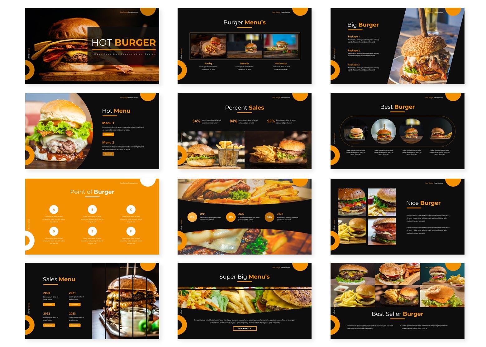 汉堡食品PPT/Keynote/谷歌幻灯片三合一模板,一款出色的 Google 幻灯片模板、Keynote模板和 Powerpoint模板,可满足多用途演示业务或个人需求。此模板上的所有元素均可从 Google 幻灯片、Keynote 模板、Powerpoint 模板形状进行编辑,无需其他软件,只需在模板上编辑即可输入您的内容,将您的图像替换为占位符,所有演示文稿都包含一张动画幻灯片,并向客户展示您的幻灯片。