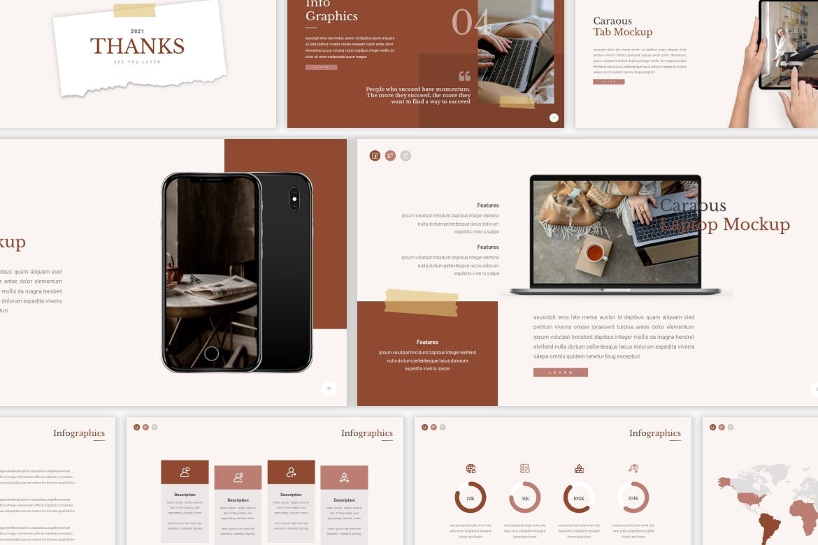 咖啡色Gslide/Keynote/PPT幻灯片三合一模板,可以立即使用。干净、可扩展、多彩和多用途。适用于商业、演示、电子商务或产品推广目的。满足所有业务或个人需求并保持产品质量,此模板上的所有元素都可以从 Google 幻灯片、Keynote 和 Powerpoint中编辑,无需其他软件,输入您的内容,将您的图像替换为占位符,更改颜色,并且所有演示文稿都包括动画幻灯片并向客户展示您的幻灯片。