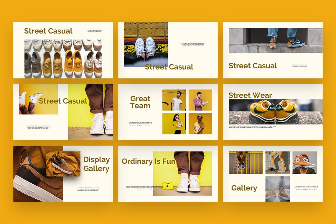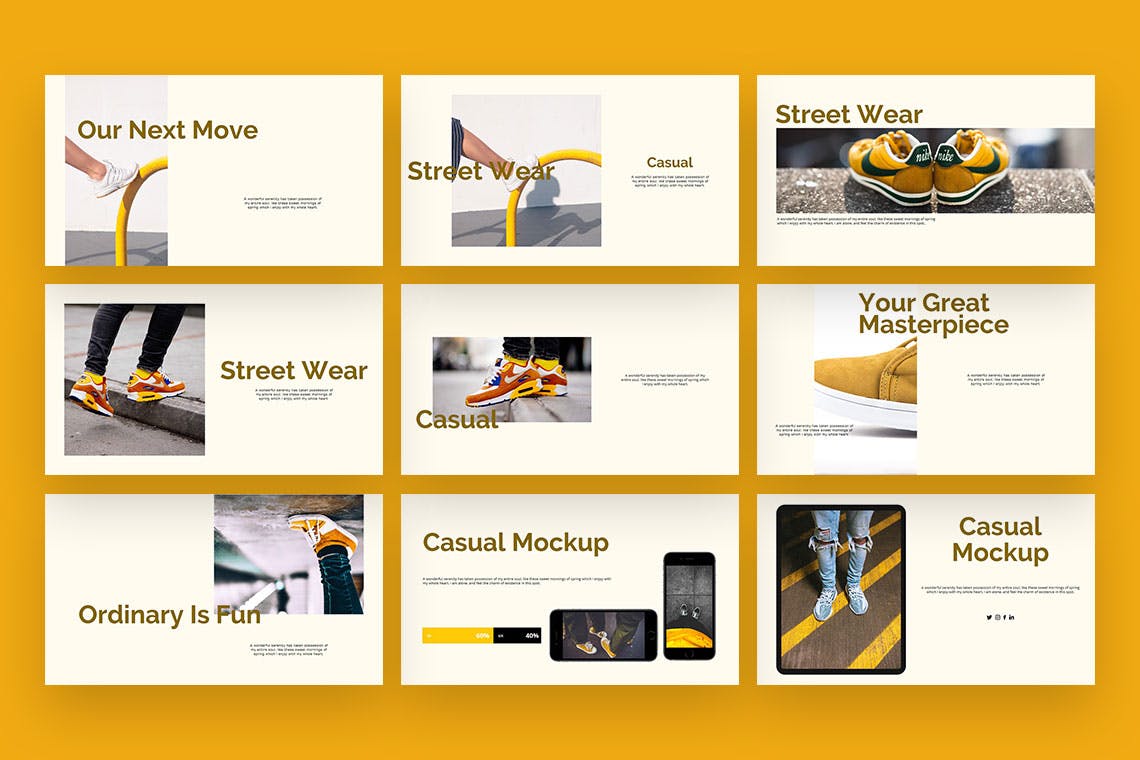 时尚潮鞋产品展示Keynote幻灯片模板,以时尚简约的设计使您的演示变得如此轻松,此外,以充满爱与激情的方式制作了此潮鞋幻灯片模板。享受和快乐的设计。