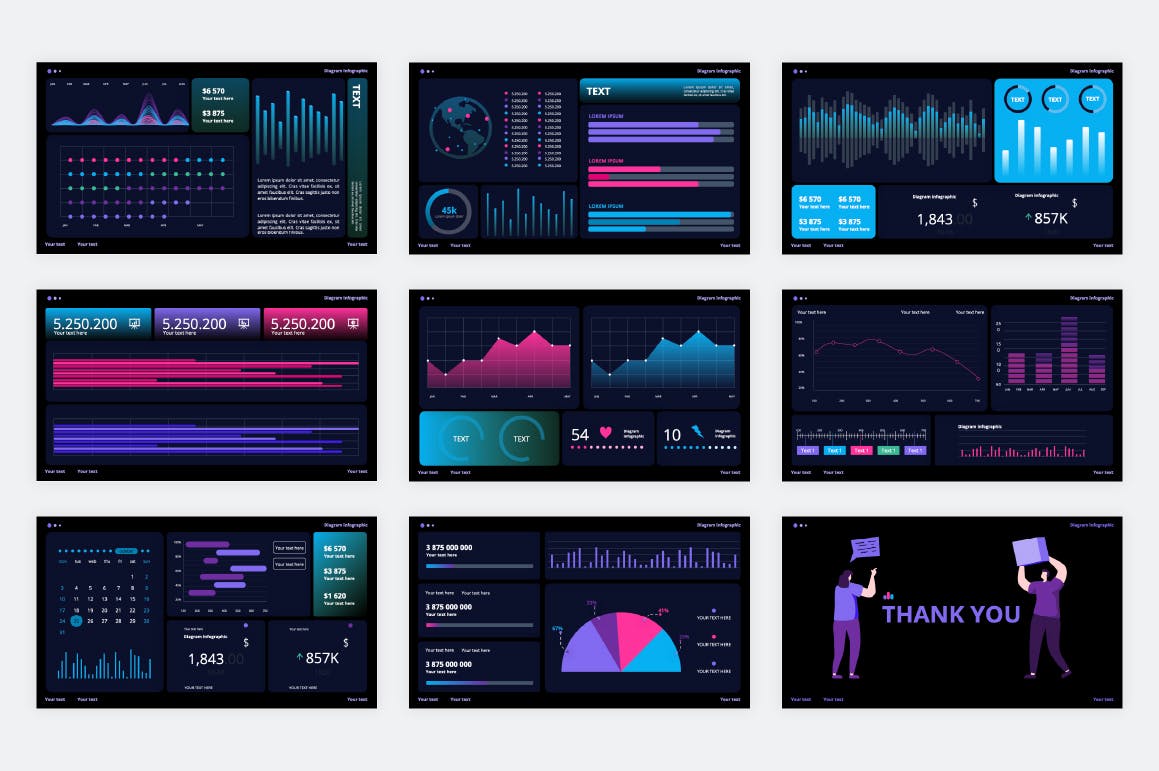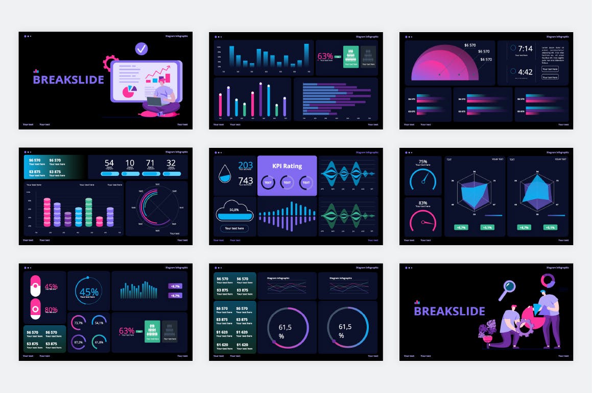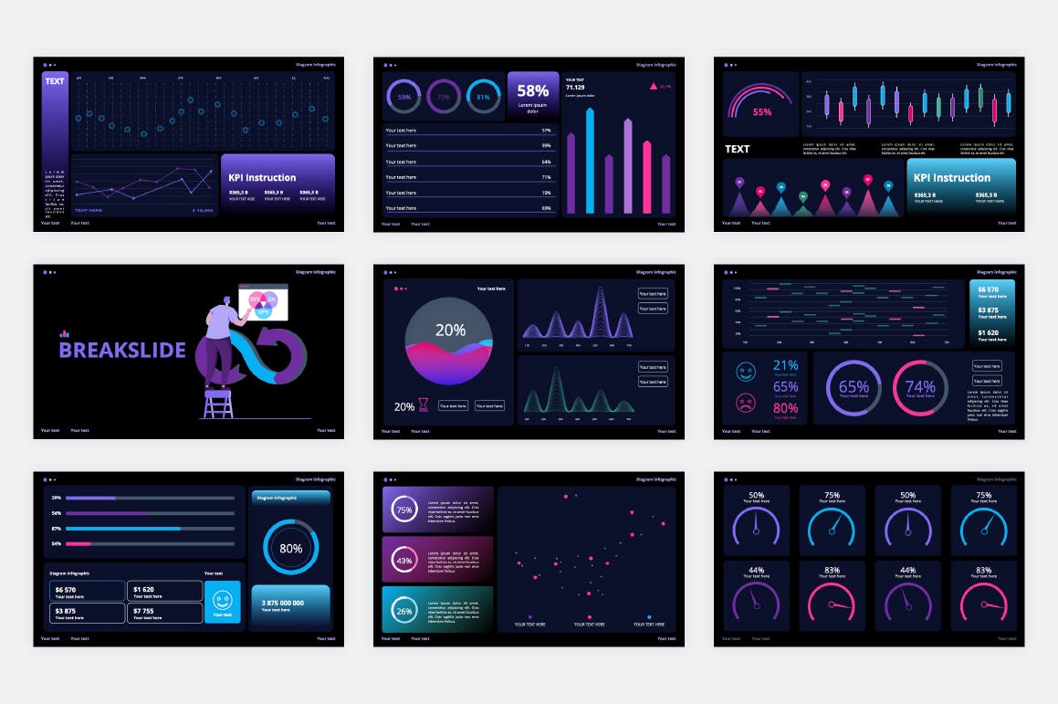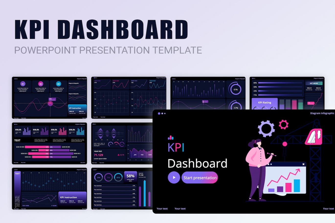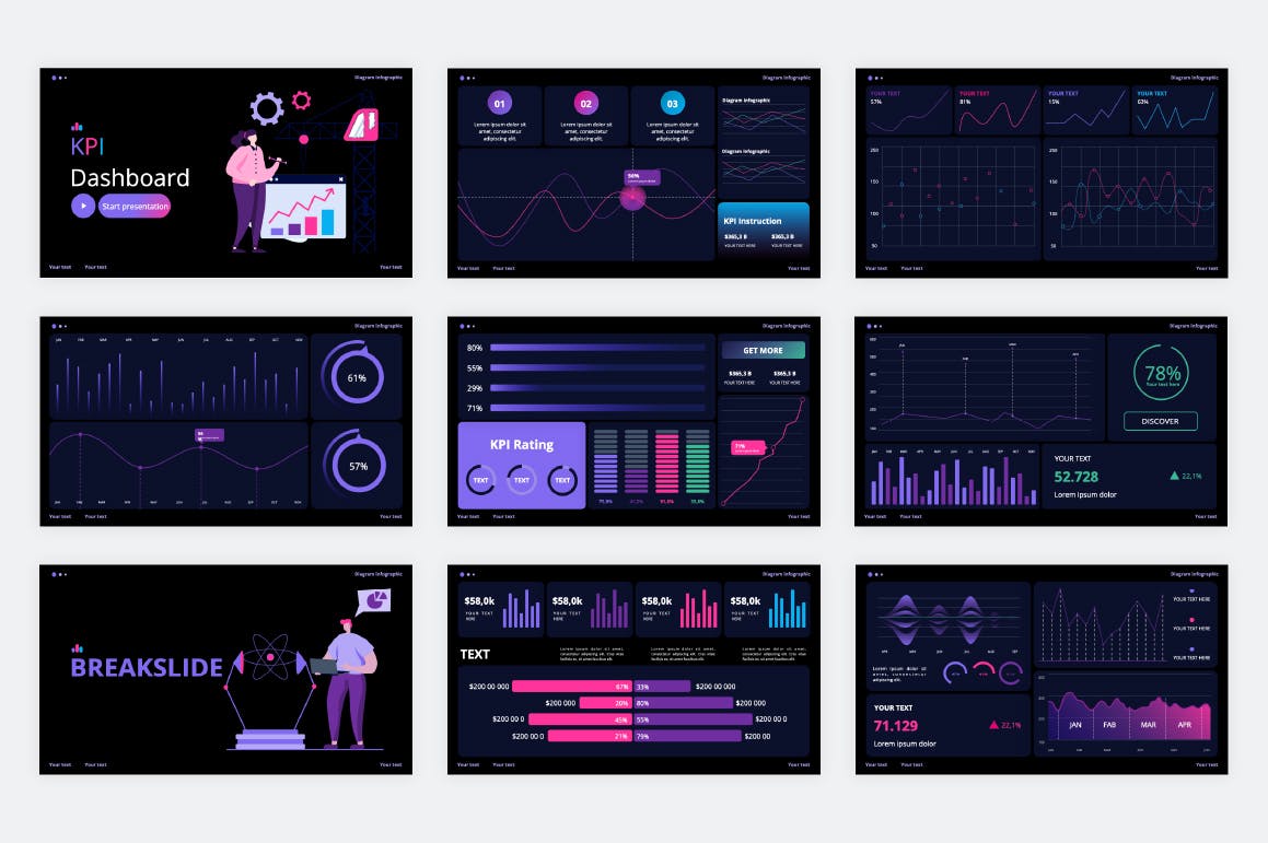 KPI 仪表板多用途 powerpoint 演示文稿,动画幻灯片设计模板。获得设计精美、功能强大且专门针对商业计划和推销平台的现代演示文稿。