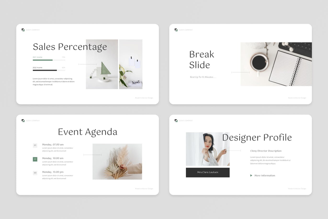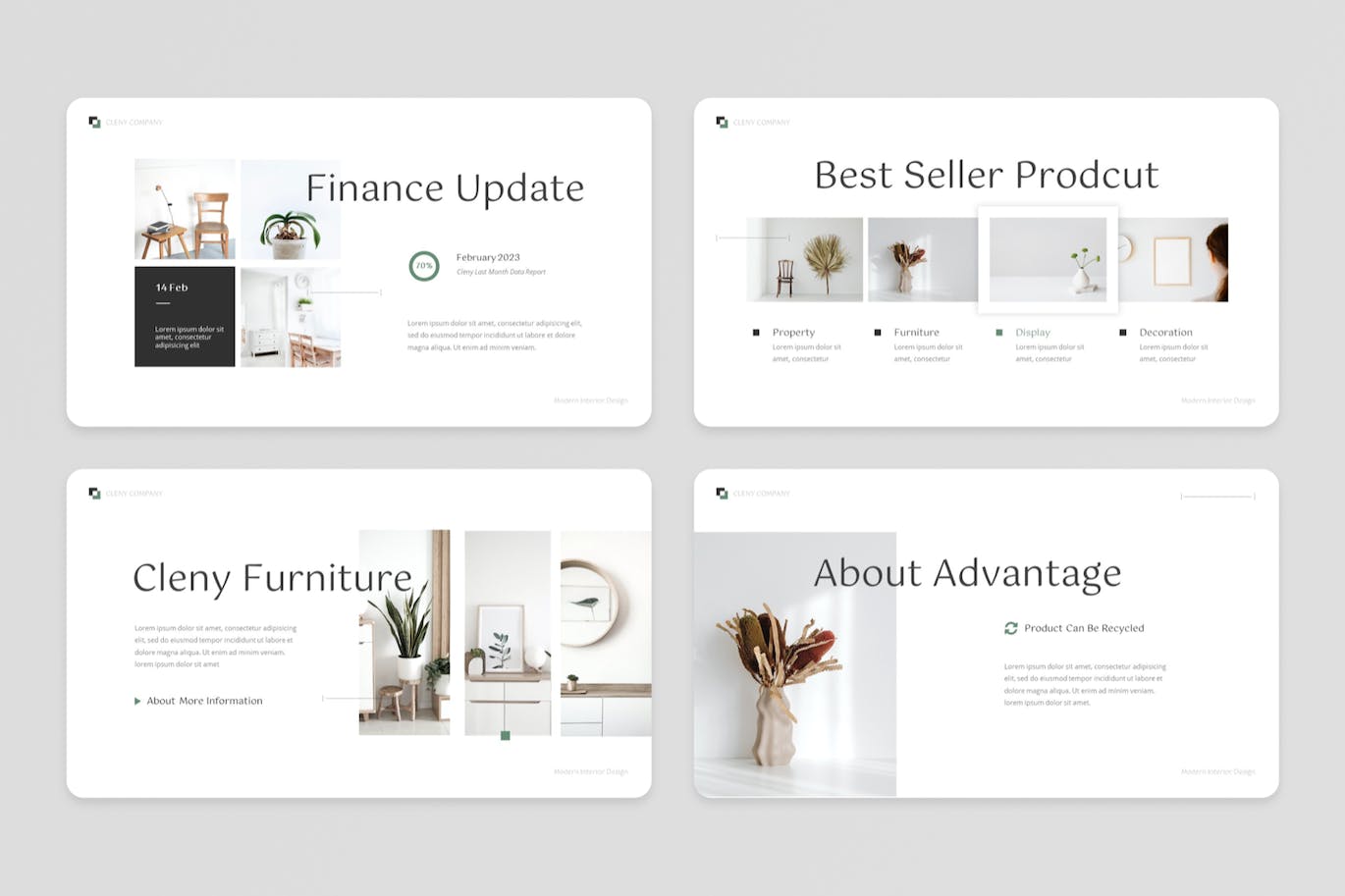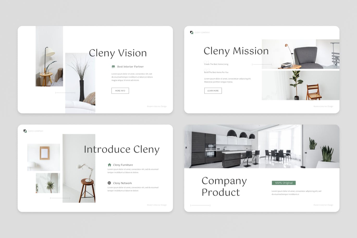 干净的现代室内设计PPT模板是一种专门设计用于展示现代室内设计项目的演示文稿模板。它提供了多种简洁、时尚和视觉吸引力的幻灯片布局和图表元素,帮助您有效地呈现室内设计的创意和概念。这个模板的用途广泛,适用于室内设计师、建筑师、装修公司等相关行业的演示和展示活动。您可以使用这个模板来展示室内设计项目的平面布局、色彩方案、材料选择、家具摆放等方面的信息。通过模板中提供的图表、图像和排版样式,您可以制作出一份简洁、精美和具有现代感的现代室内设计演示文稿。