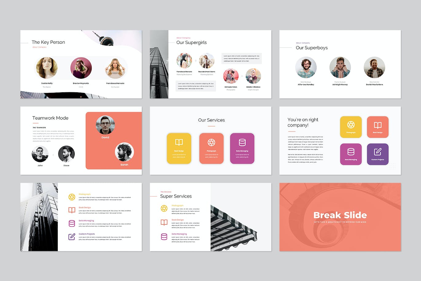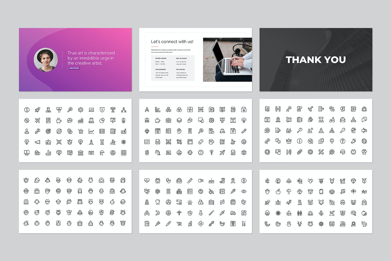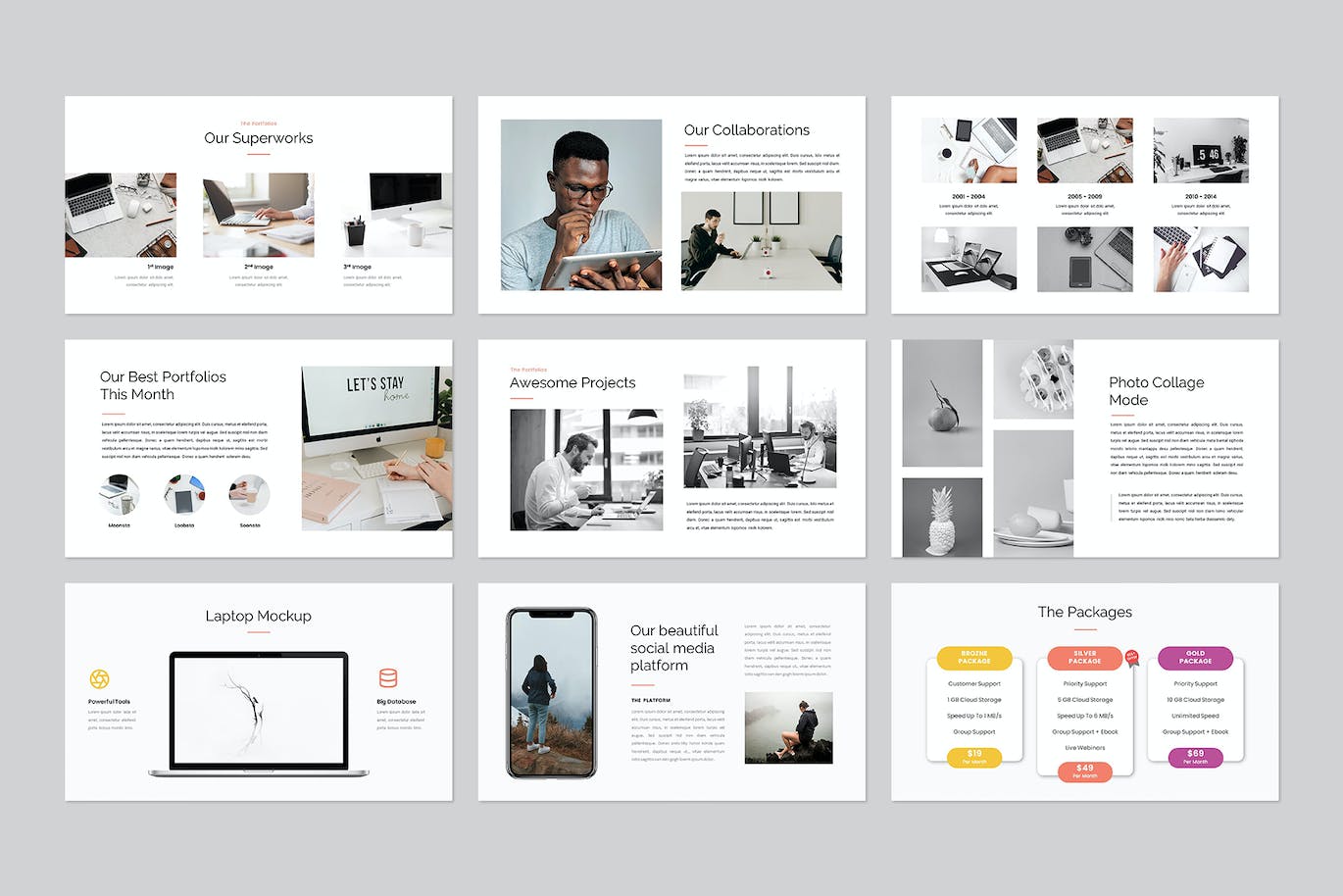 此模板是一个富有创意且清晰的演示文稿,用于展示您的品牌。对于每一位想要展示自己品牌的商人、创作者、设计师、学生、讲师来说,这都是正确的展示。无需使用任何额外的软件。节省您的时间!