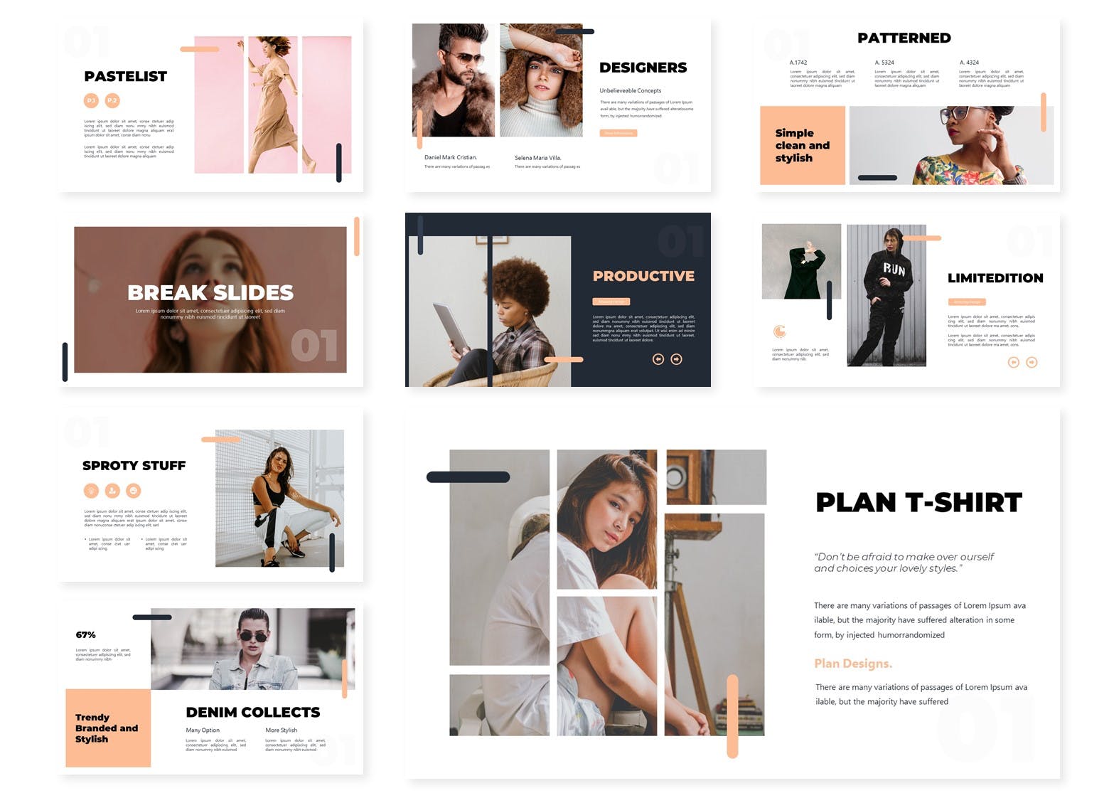 这是一款适合多用途演示业务或个人需求的服装品牌设计Keynote幻灯片模板。此服装幻灯片模板上的所有元素都可以通过Keynote进行编辑,输入内容,将图像替换为占位符,更改颜色,然后所有演示都包括一个动画幻灯片并将幻灯片展示给你的客户。