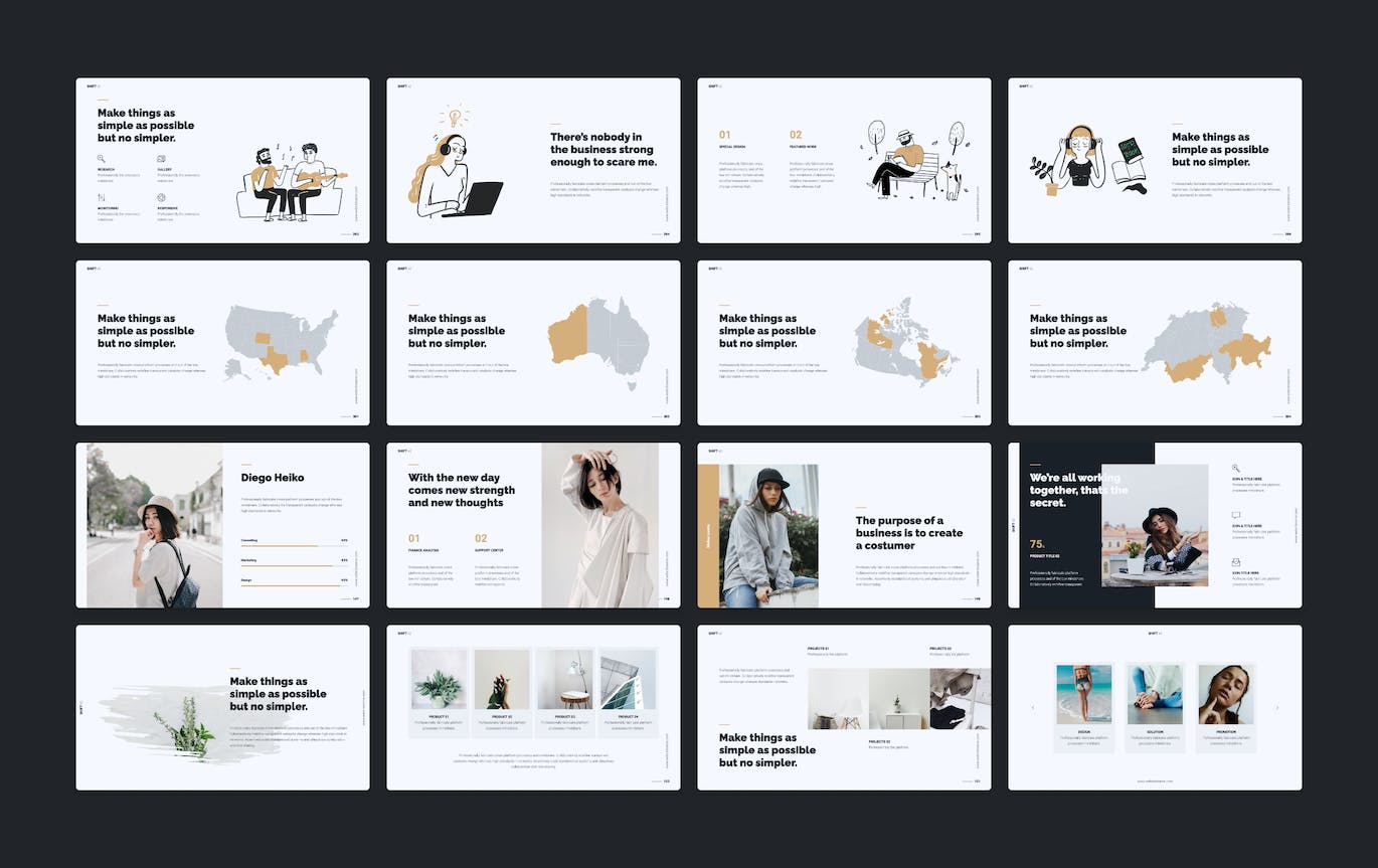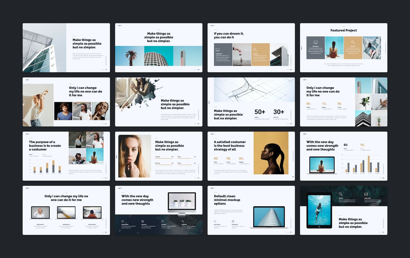“SHIFT”最小和多用途演示文稿生成器使您有机会使用现代且有价值的元素(例如投资组合、排版、服务、图标、数据图表、表格、信息图表、模型、世界地图等)创建各种演示文稿。 。