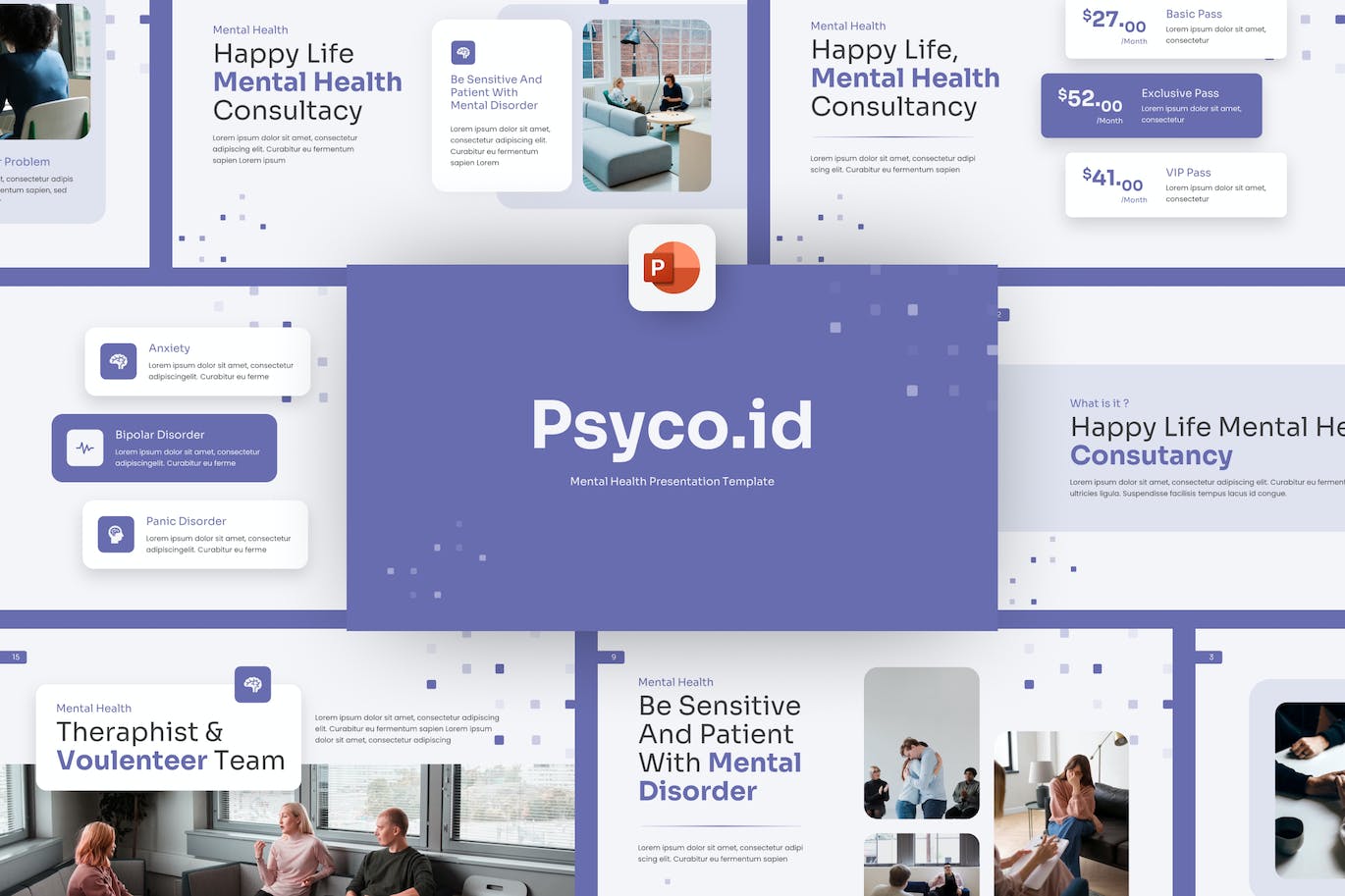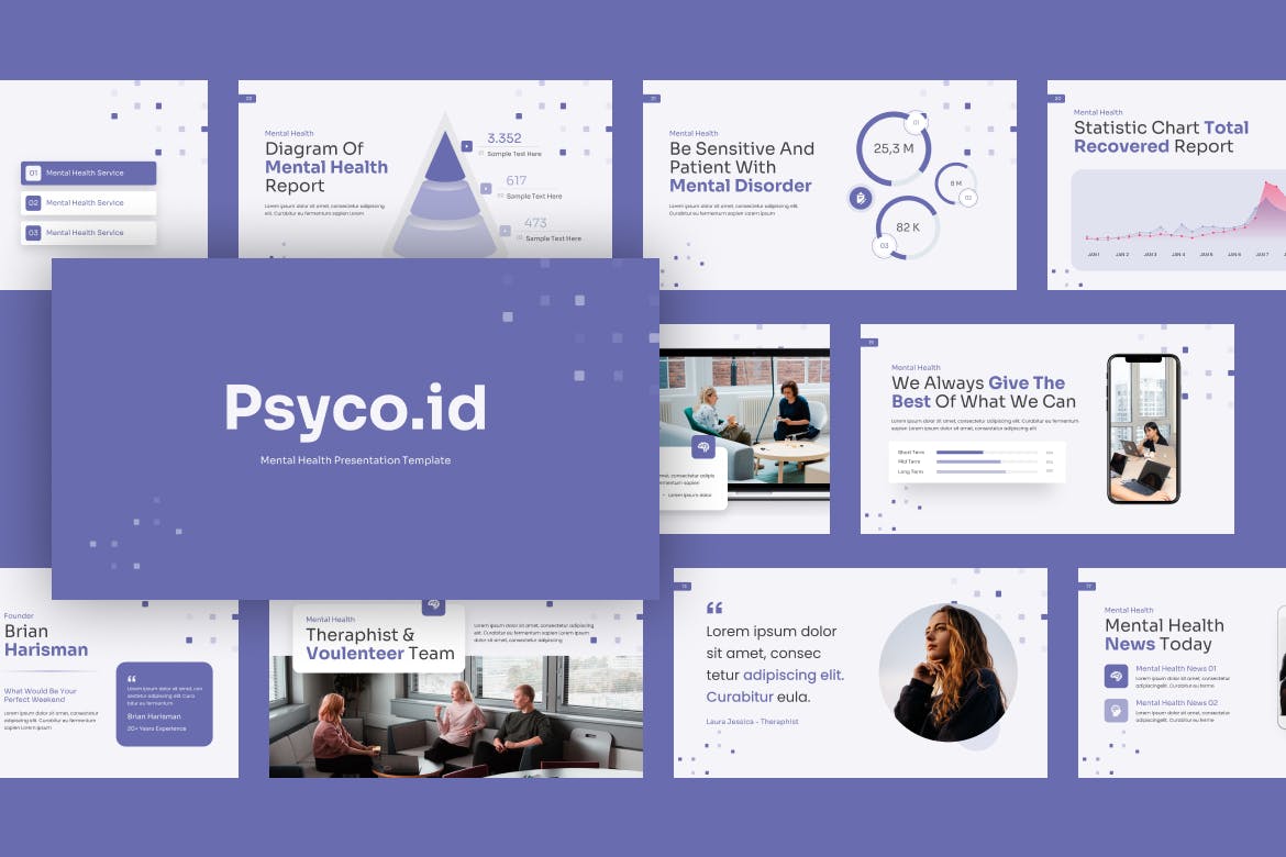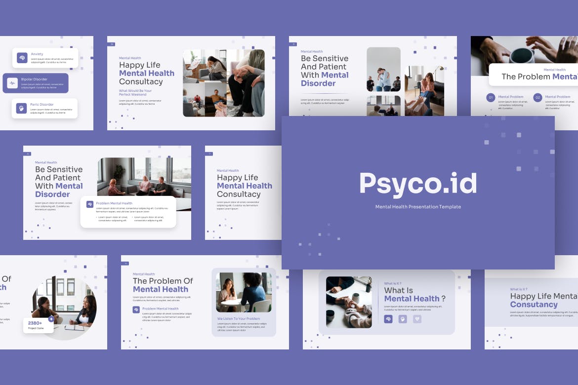 **Psyco.id Purple Mental Health PowerPoint模板**是一个现代的心理健康演示模板,非常适合用于商业演示、画册幻灯片、项目推介等。