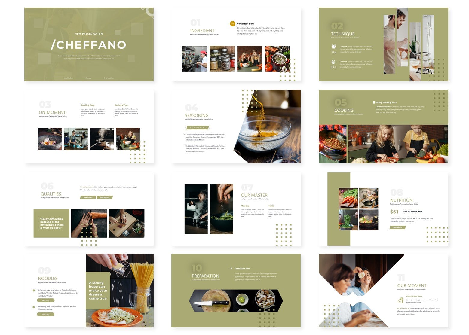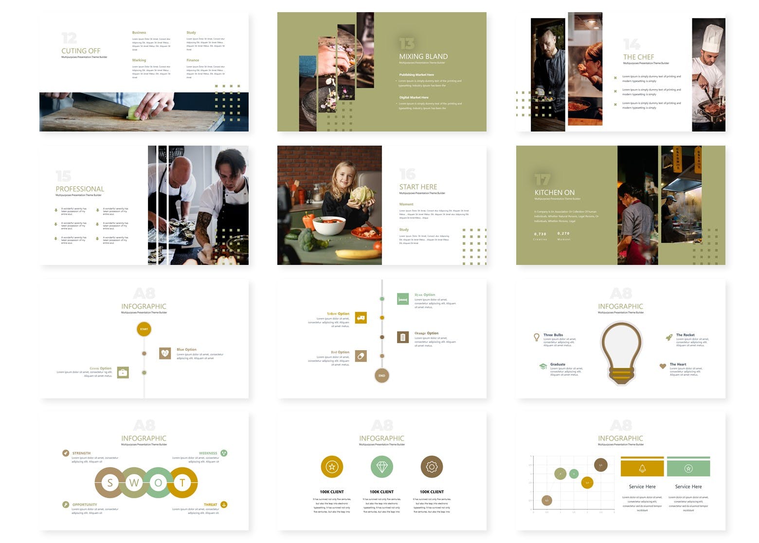 满足个人&企业需求的烹饪教学课程演示PPT模板,包含很棒的Google SLides模板,Keynote模板和Powerpoint模板。此烹饪ppt模板上的所有元素都可以通过Google SLides、Keynote、Powerpoint进行编辑,而无需其他软件,将图像替换为占位符,更改颜色,所有演示都包括一个动画幻灯片,并向全世界展示您的幻灯片。
