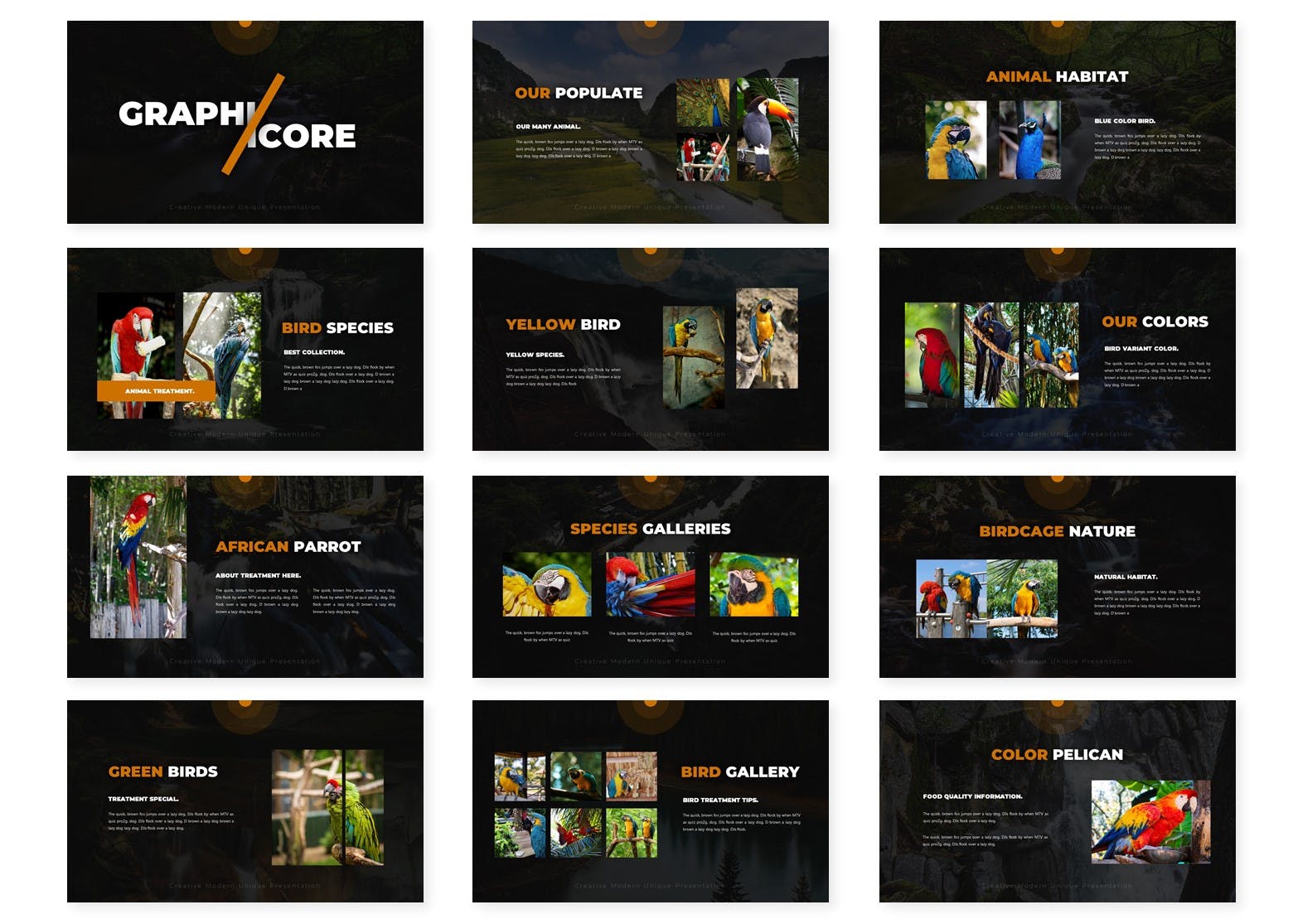 满足个人&企业需求的鹦鹉鸟类动物科普演示文稿PPT模板,包含很棒的Google SLides模板,Keynote模板和Powerpoint模板。此鸟类动物ppt模板上的所有元素都可以通过Google SLides、Keynote、Powerpoint进行编辑,而无需其他软件,将图像替换为占位符,更改颜色,所有演示都包括一个动画幻灯片,并向全世界展示您的幻灯片。