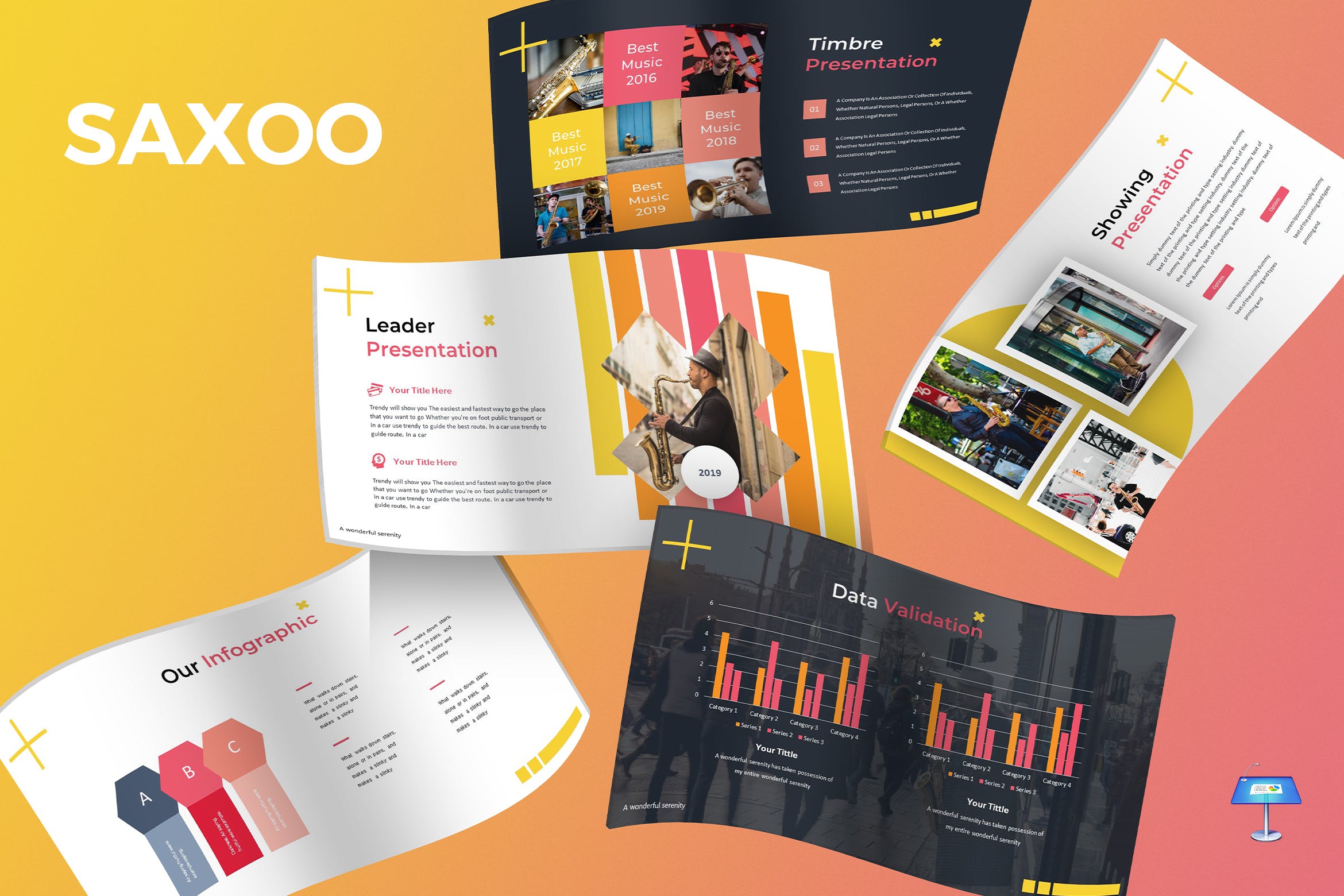 这是一款适合多用途演示业务或个人需求的萨克斯音乐主题Keynote幻灯片素材。此萨克斯幻灯片模板上的所有元素都可以通过Keynote进行编辑,输入内容,将图像替换为占位符,更改颜色,然后所有演示都包括一个动画幻灯片并将幻灯片展示给你的客户。