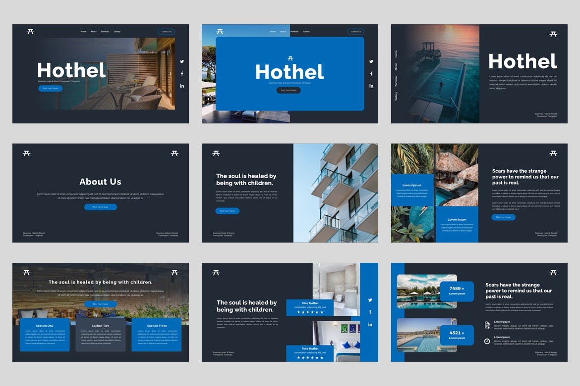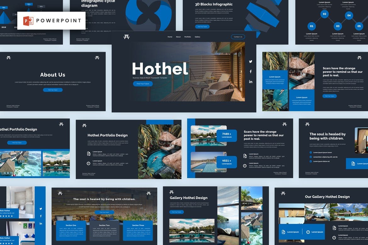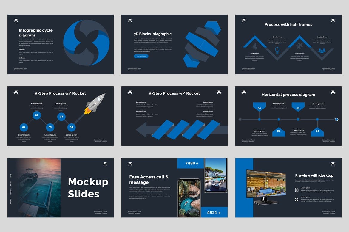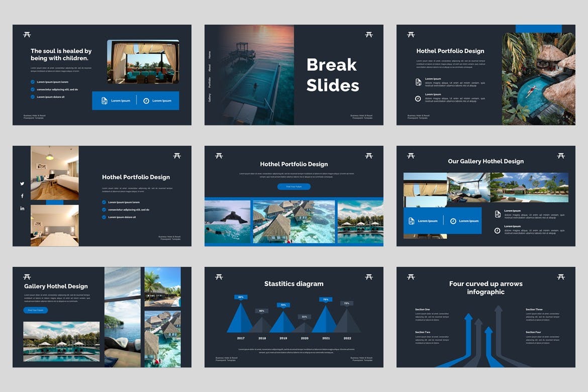 这个模板适用于展示酒店和度假村的介绍和推广。您可以使用该模板展示酒店及度假村的特色、设施、服务和环境等,以吸引潜在客户或投资者的注意。