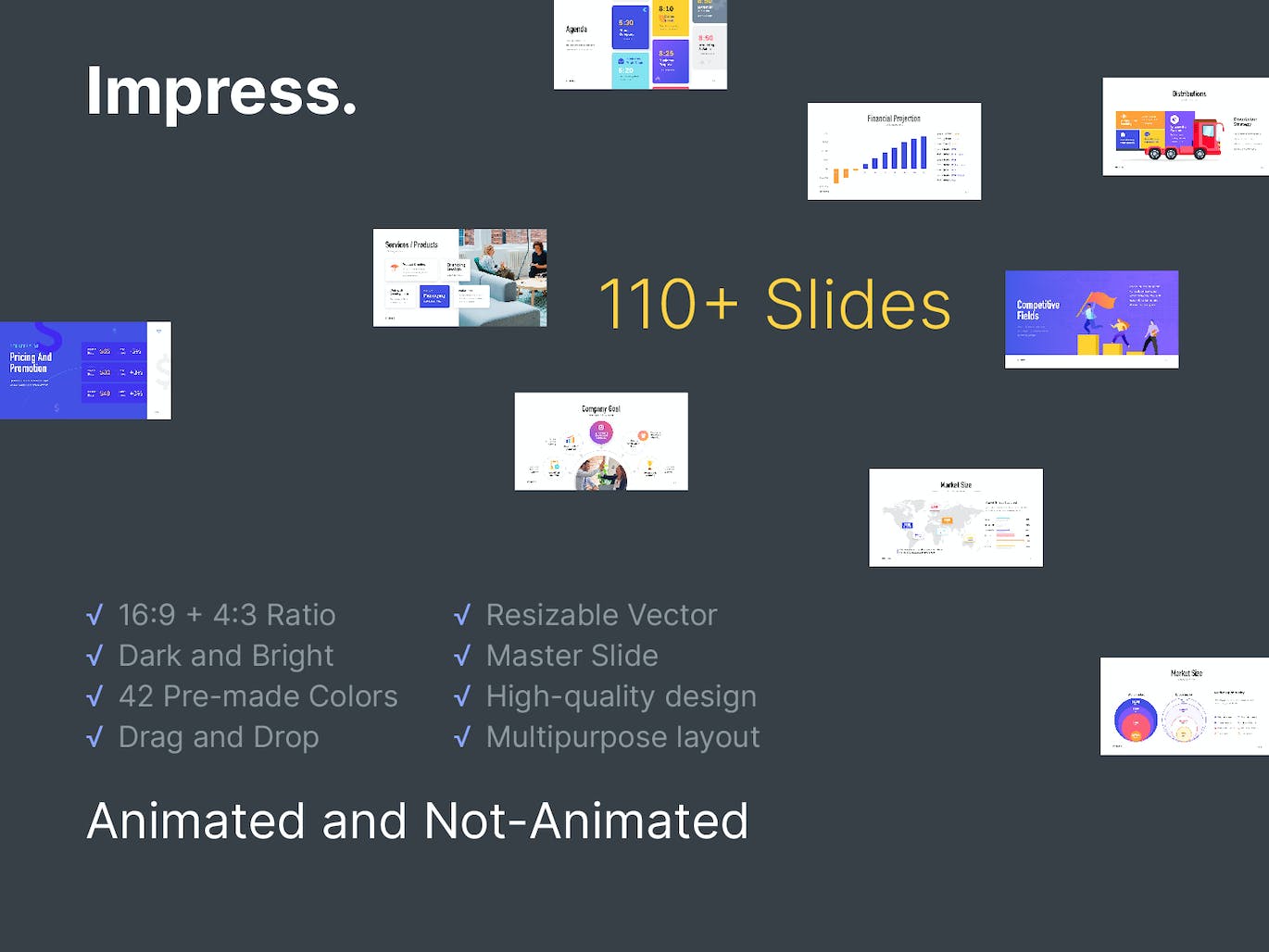新面貌、专业、现代和干净的商业宣传 PowerPoint 演示模板。非常适合公司业务演示。只需拖放或单击即可轻松插入所有图片。专业的布局,独特实用的设计。此项目包括 160 多张(包括深色和明亮的)幻灯片,随时可以给您的观众留下深刻印象!