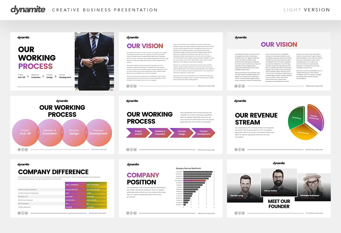 Dynamite 是一个以现代和新鲜为基调的模板,适合创意公司、企业、企业家和专业人士使用。这个模板包括25张独特的幻灯片,有两种颜色主题:深色和浅色。具有不同类别、标题、段落、团队、价值观、公文包、服务和联系人的独特幻灯片。