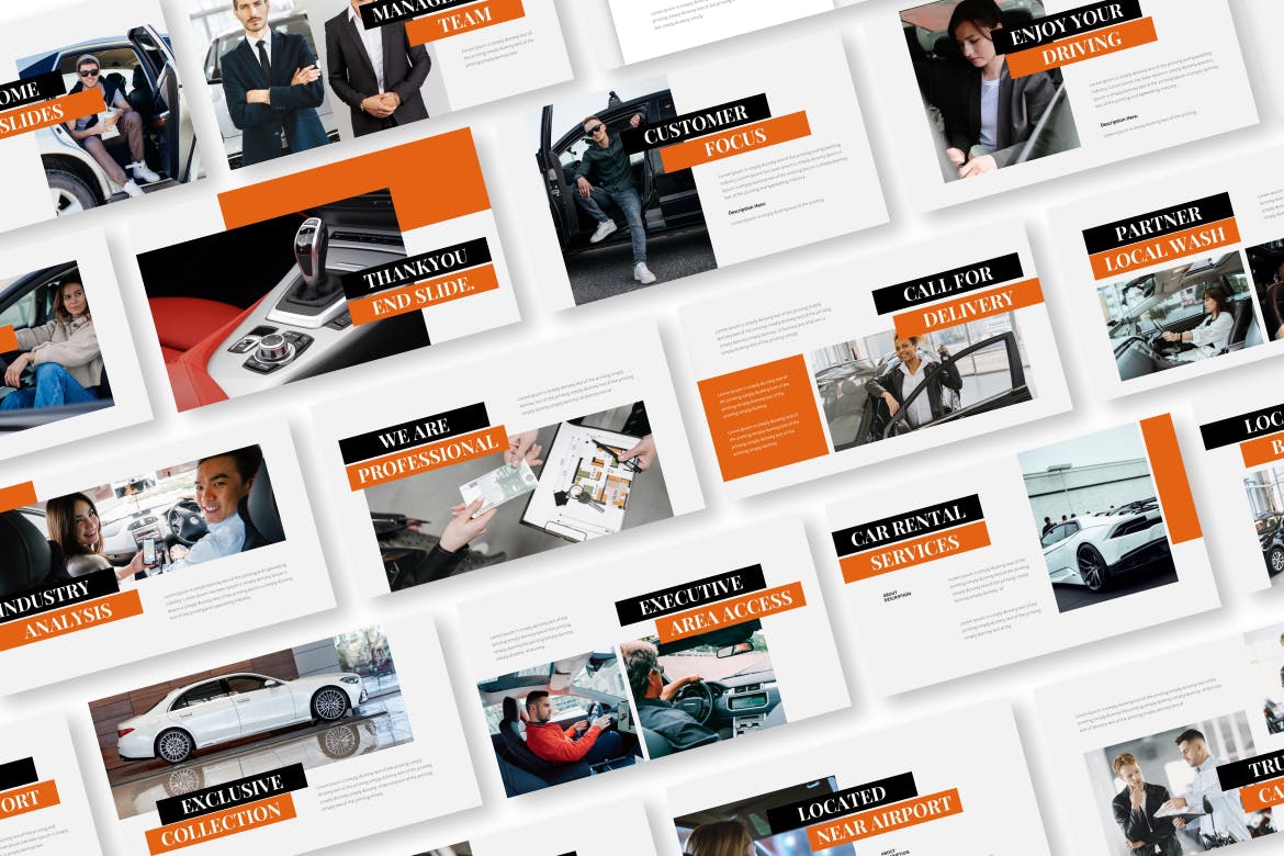 汽车租赁服务PPT模板,用于您的公司简介、营销和多功能业务, 所有元素、颜色、形状和图表都可以轻松修改和编辑,HD 16:9 宽屏幻灯片格式(1920×1080 像素)。