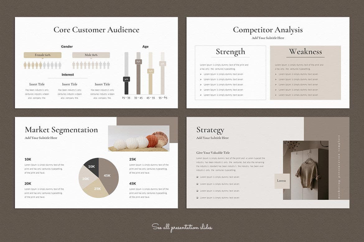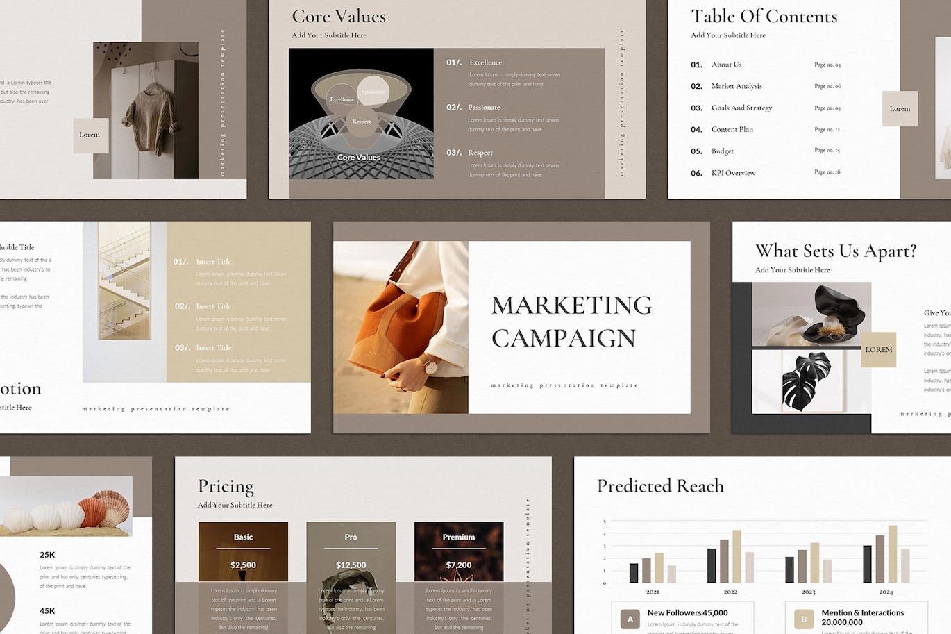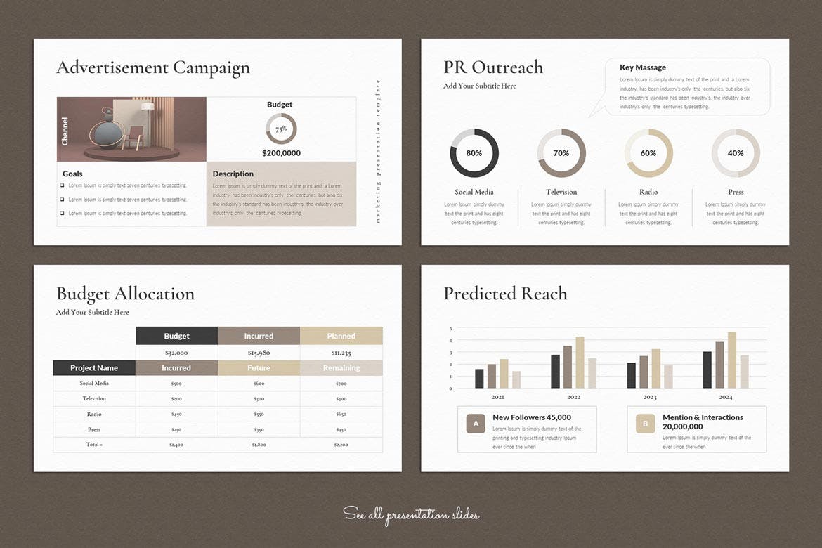 用于创建强大且引人入胜的营销计划的终极工具。该模板具有 24 张独特的幻灯片和 16:9 的宽高比,旨在使您的演示文稿在视觉上令人惊叹且有效。从定义您的目标受众到概述您的营销活动目标,此模板包含您制定成功的营销策略所需的一切。立即开始使用这个易于使用的模板给您的观众留下深刻印象。