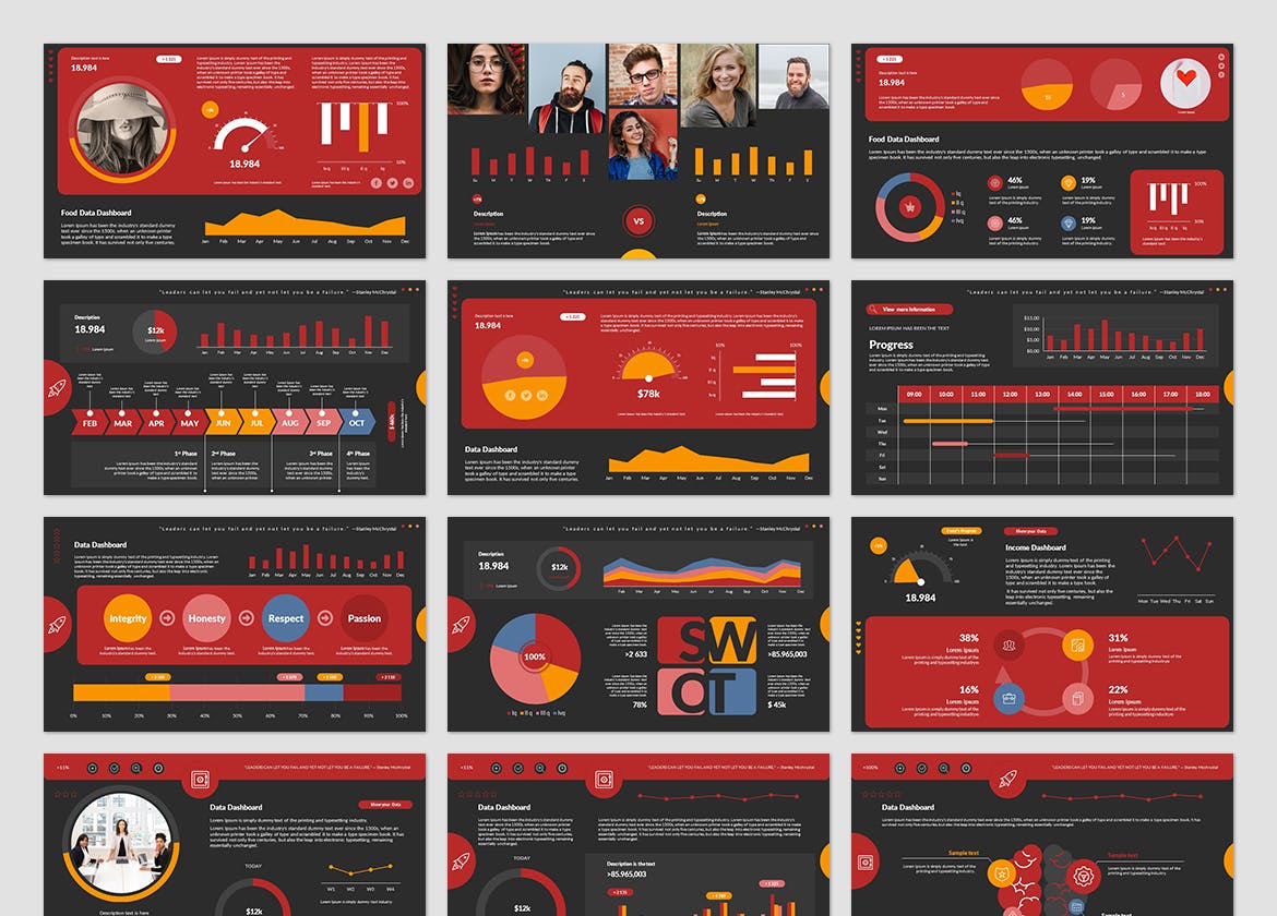 用项目进度仪表盘演示PPT模板来呈现和清晰显示数据。 30 张独特的幻灯片,16:9 纵横比,5 种配色方案,每种配色方案的深色和浅色版本。