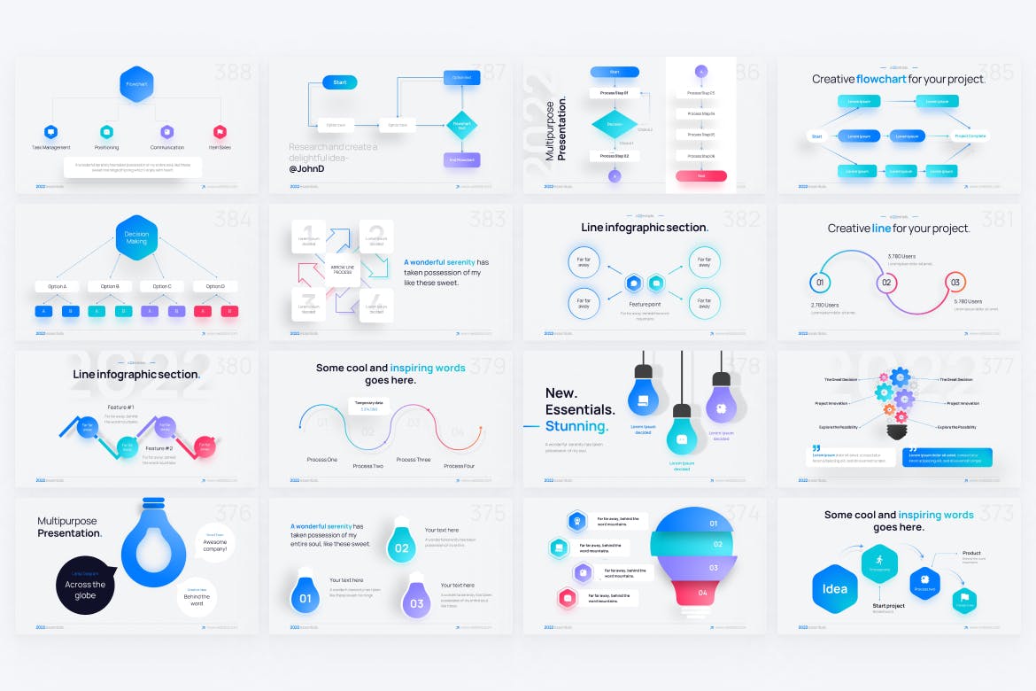 我们现在可以轻松找到许多令人惊叹的演示模板。因此,我们需要转变思维方式,不仅要展示完美的幻灯片,还要提升其中的体验。在这里,我们向您展示六边形/直线和流程图PPT模板,用于伴随您业务发展的每个阶段和整体品牌接触点,从开始一个新项目,在竞争对手中建立认可度,到以改进的目标主张结束它。