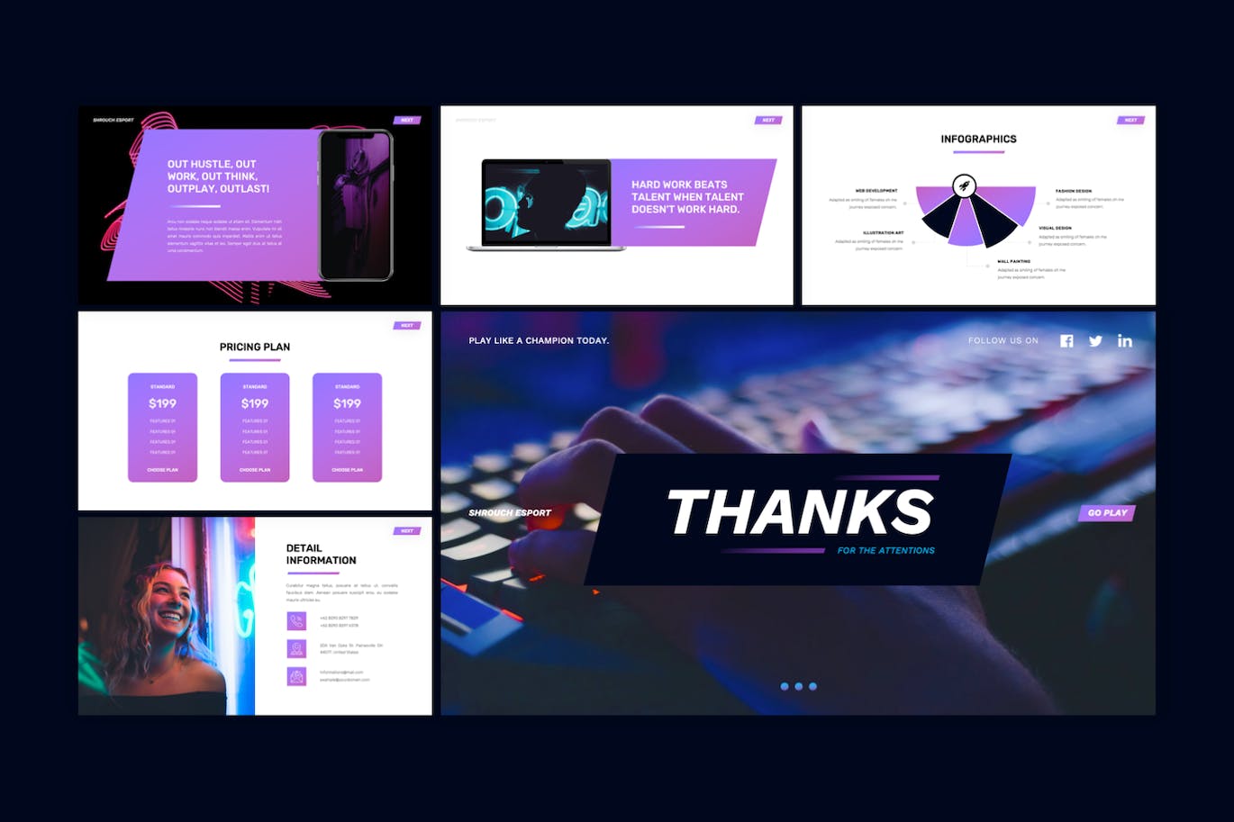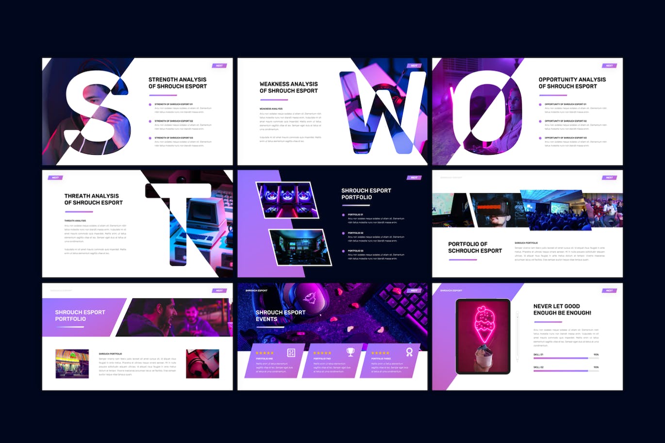 Pitch Deck 是必不可少的营销工具。媒体工具包用作促销工具,以帮助提高知名度、展示您的作品并解释您的服务包。因此,它需要引人注目、富有创意且制作精美。电子竞技游戏 PowerPoint模板。每张幻灯片都是独一无二的,而不仅仅是重复的布局。只需使用 PowerPoint,您就可以为您的品牌创建华丽的推销平台,它非常适合数字媒体工具包、营销工具包或您的演示文稿。