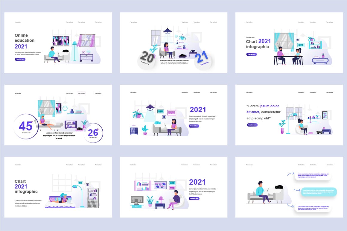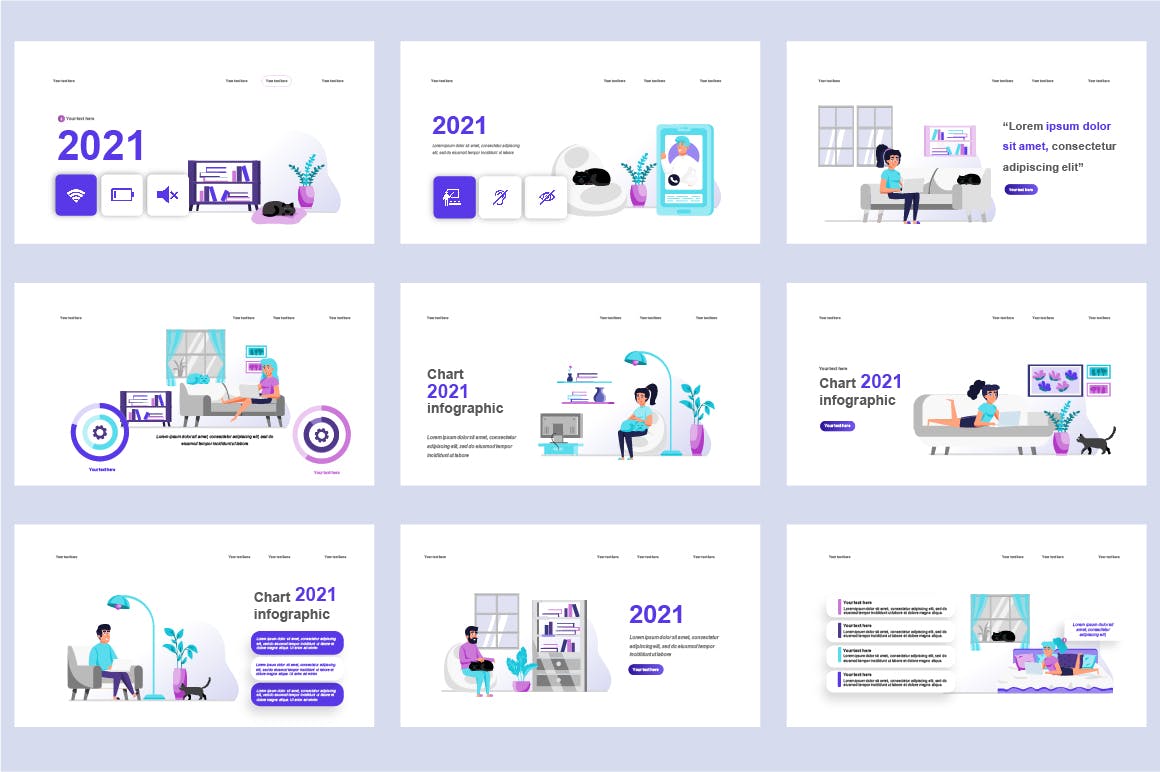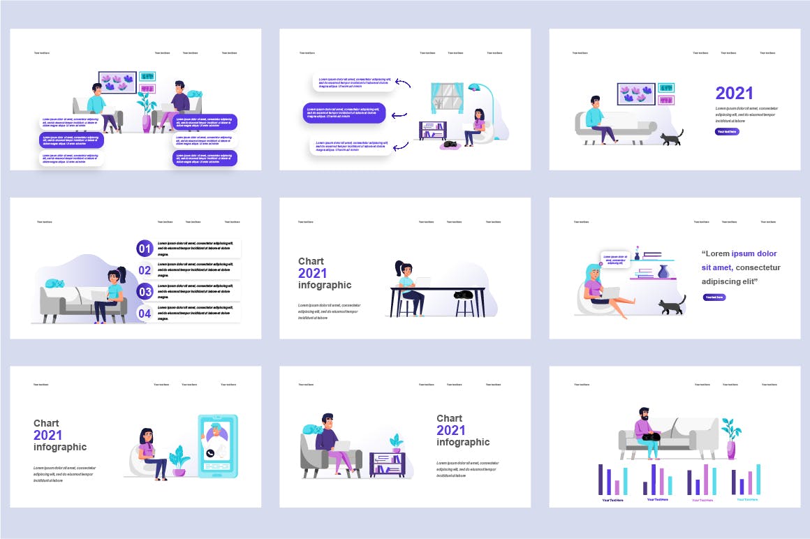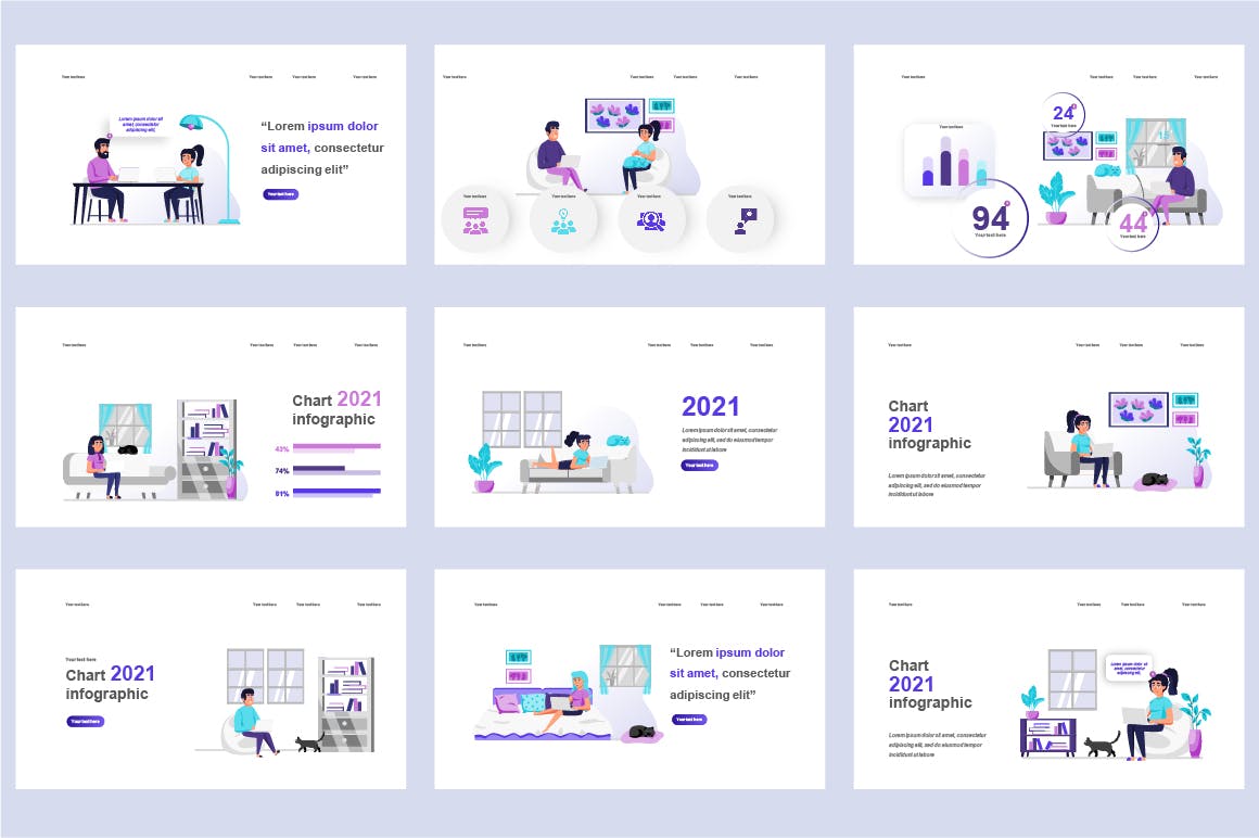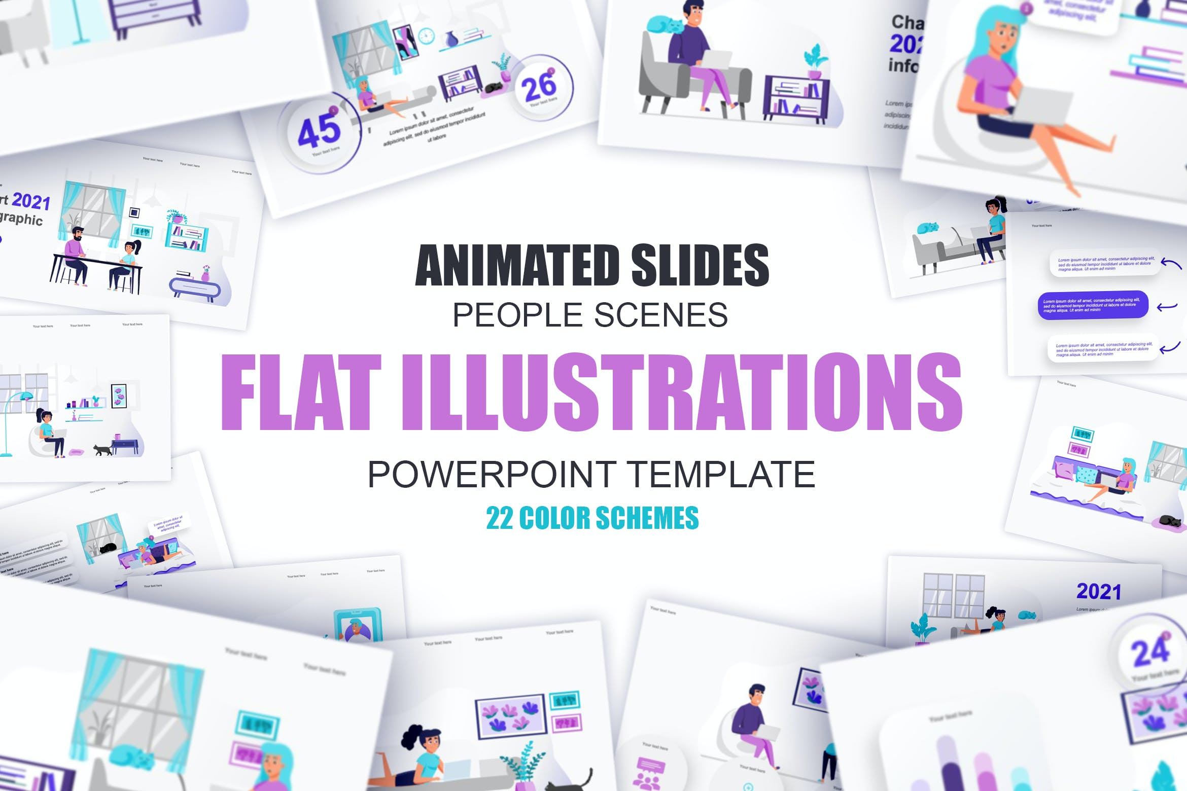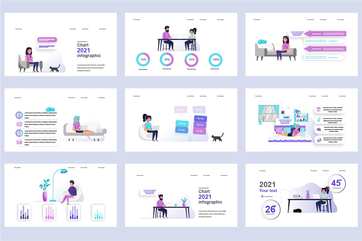 自由工作平面插图数据可视化 powerpoint 动画幻灯片设计模板。不同人物角色场景、图表、图表、工作流、流程图、工具包、图形设计模板。Powerpoint 幻灯片信息图形和插图概念集。