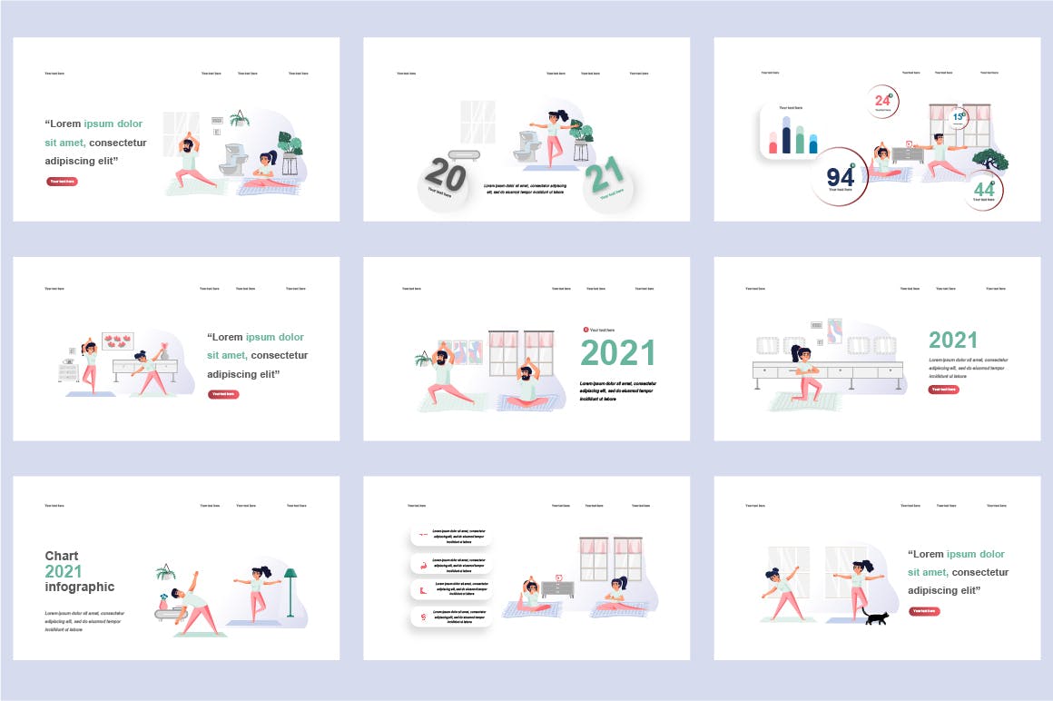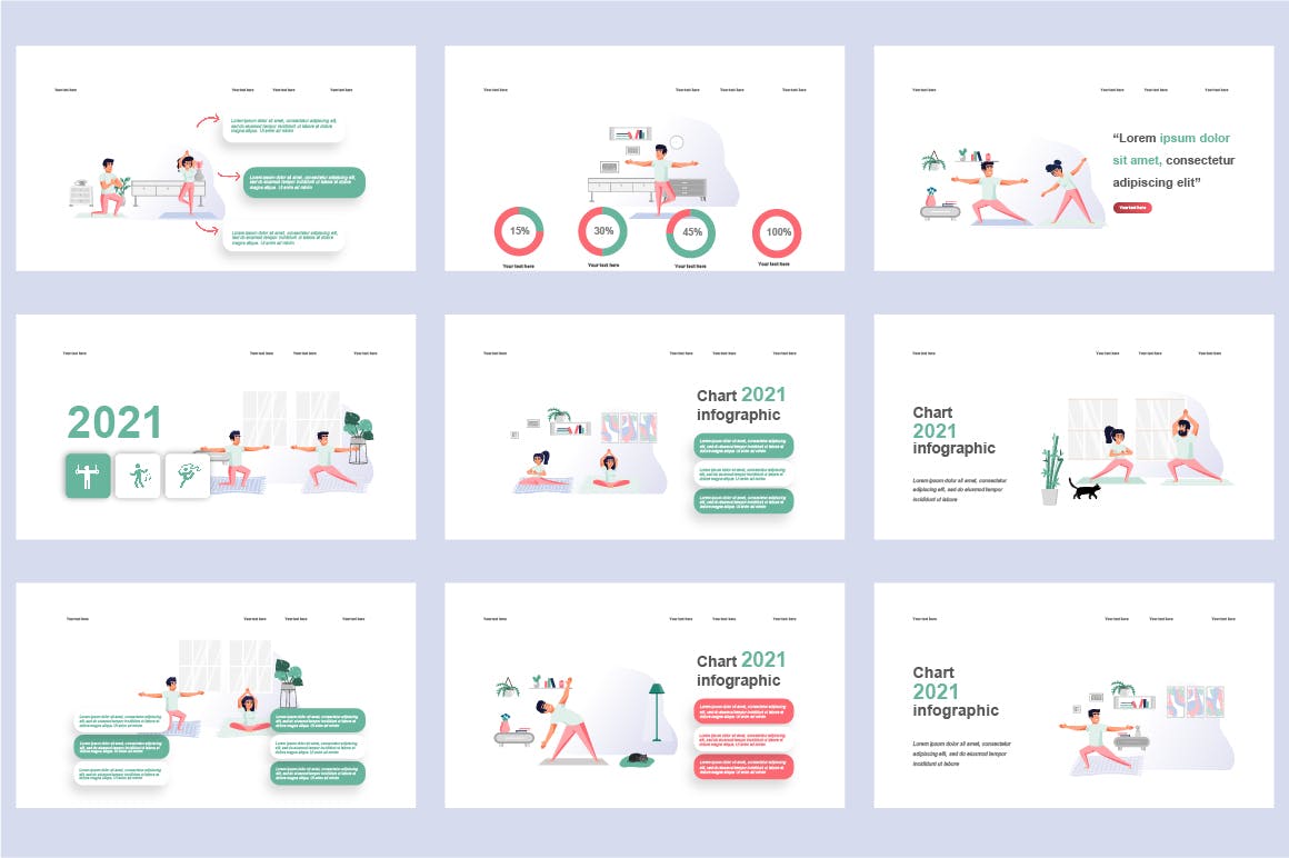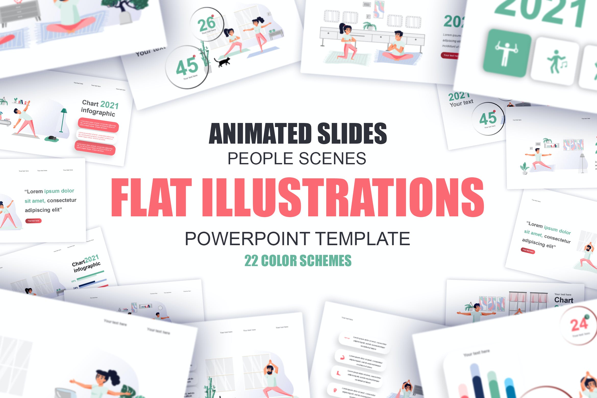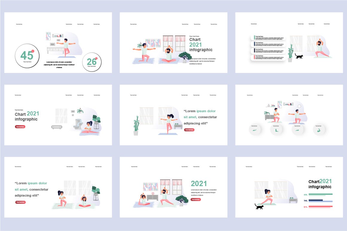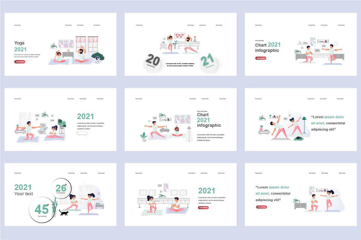 瑜伽平面插图数据可视化 powerpoint 动画幻灯片设计模板。不同人物角色场景、图表、图表、工作流、流程图、工具包、图形设计模板。Powerpoint 幻灯片信息图形和插图概念集。