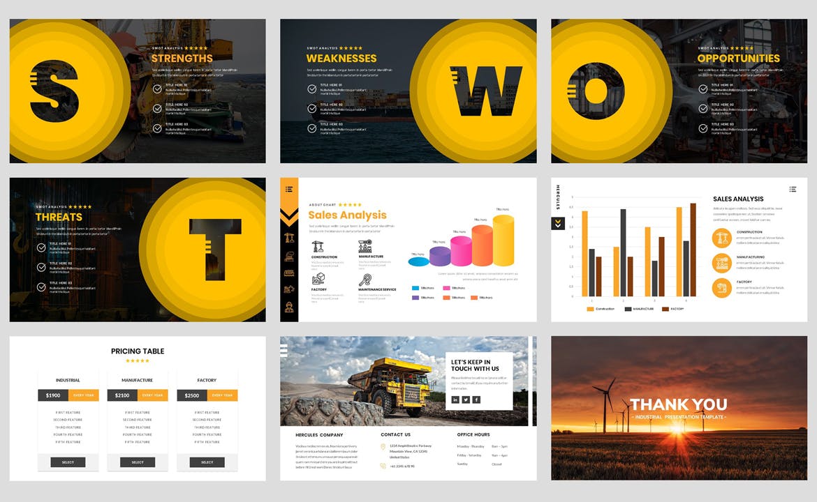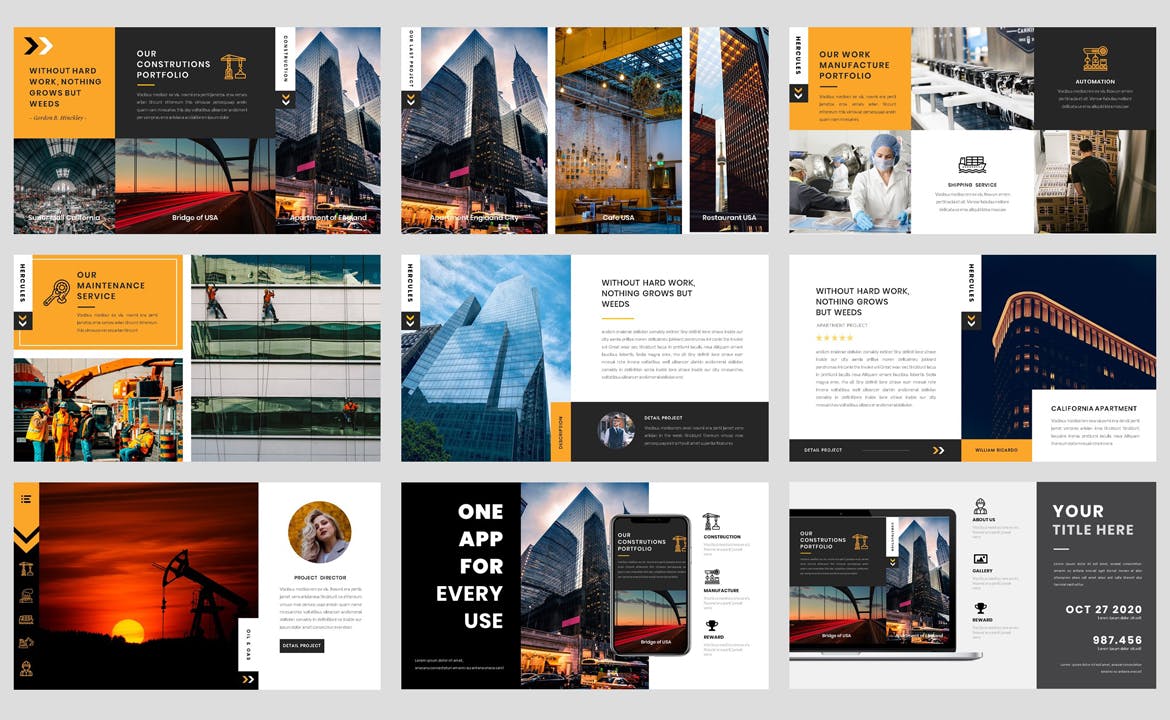 此演示文稿 PowerPoint 模板可用于各种目的,例如:建筑、商业、公司、建筑、承包商、企业、能源、工程、工厂、工业、机械、制造、制造、室内、公司介绍,公司简介,也可用于创意演示模板。此演示模板包含现代、优雅、简约、专业和独特的布局,具有基于公司、代理和公司风格的布局。
