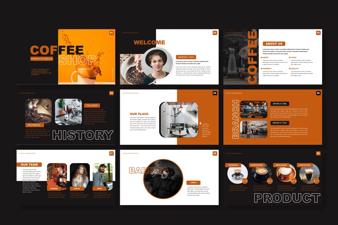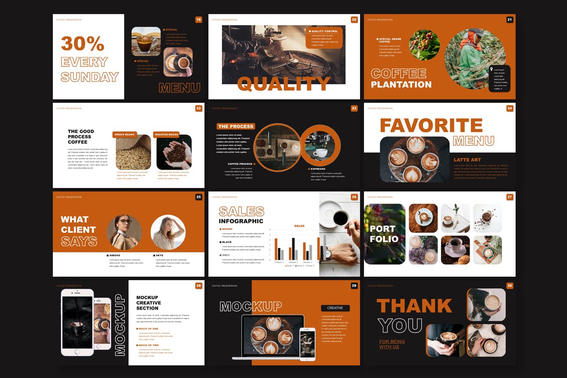 这是 30 页现代而干净的咖啡店 – Powerpoint 模板可用于任何类型的行业等等。该模板可以轻松编辑和定制。