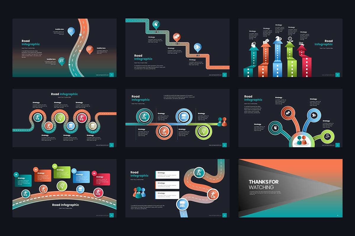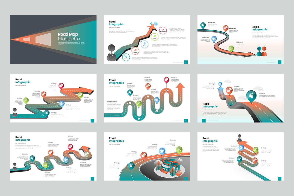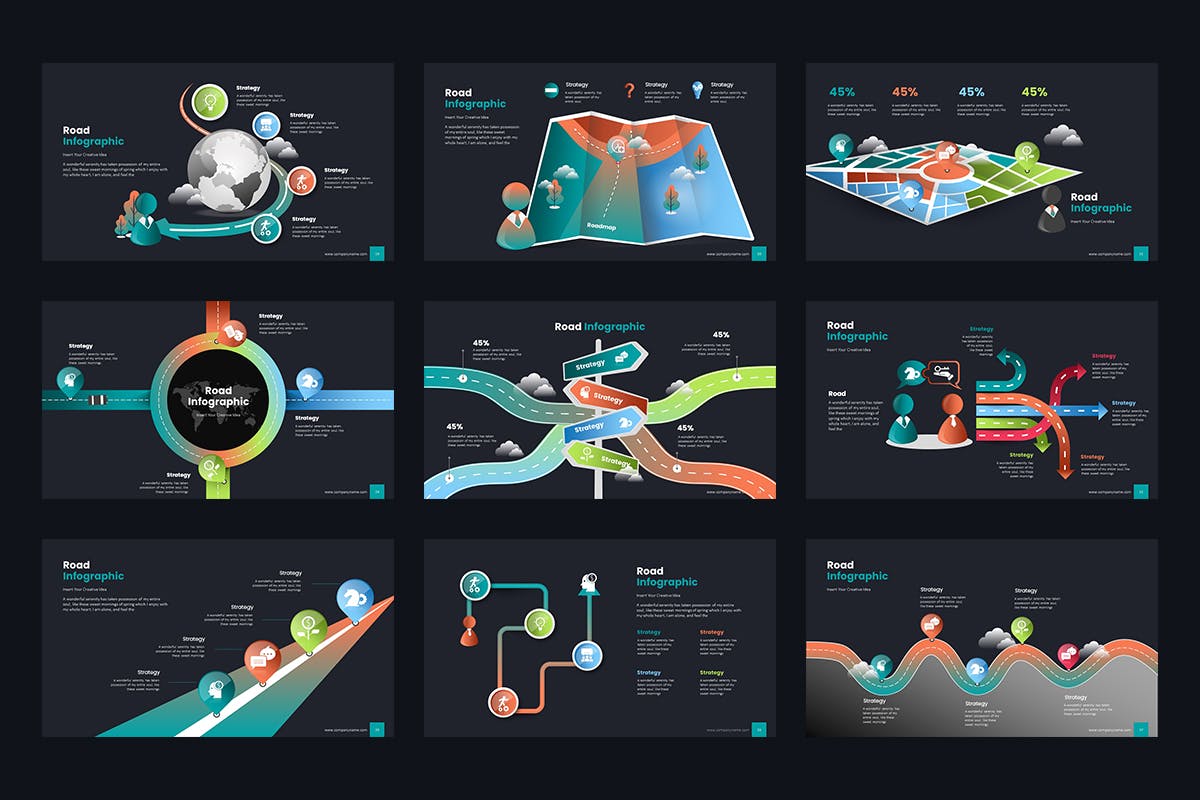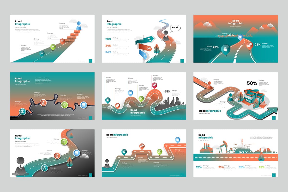 道路信息图表PPT幻灯片设计模板,非常适合您令人印象深刻的风格演示,也可以灵活地用于公司和商业演示。这个演示模板,干净、有创意、简单、独特、可扩展。所有元素都可以根据您的需要轻松编辑和定制。