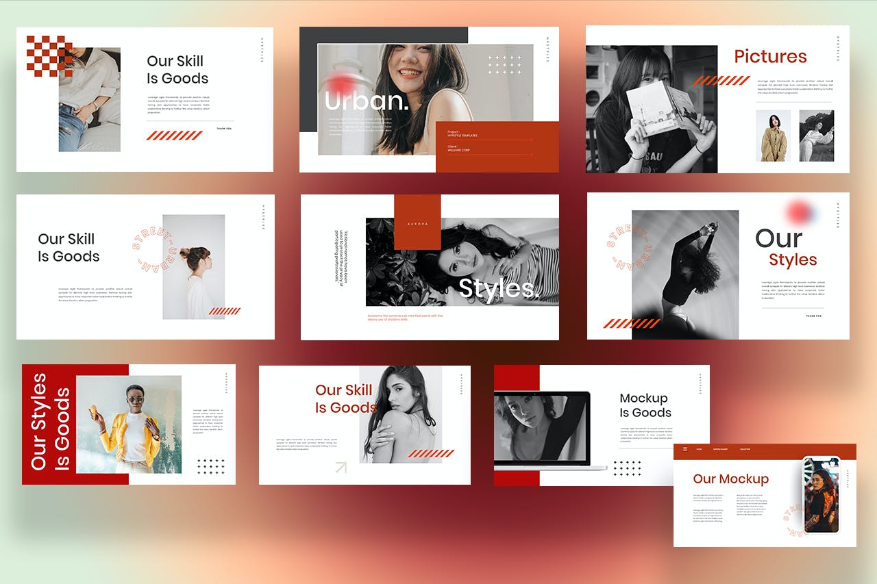带有 Slidemaster 的现代城市风格演示文稿、极简主义和灵活的演示文稿模板。非常适合时尚、都市、公司展示和个人使用。很容易改变配色方案。使用 Slidemaster 和设备模型完成完整的演示。