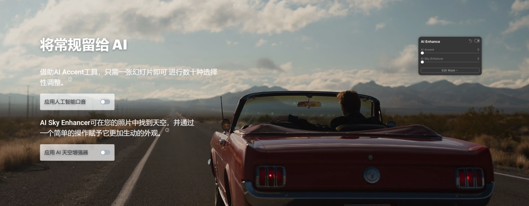 该工具会自动分析您的图像,并同时使用十几个控件立即对其进行校正,只需一个简单的滑块即可产生自然漂亮的结果。AI Accent 可以替代许多传统控件,如阴影、高光、对比度、色调、饱和度、曝光、细节等。