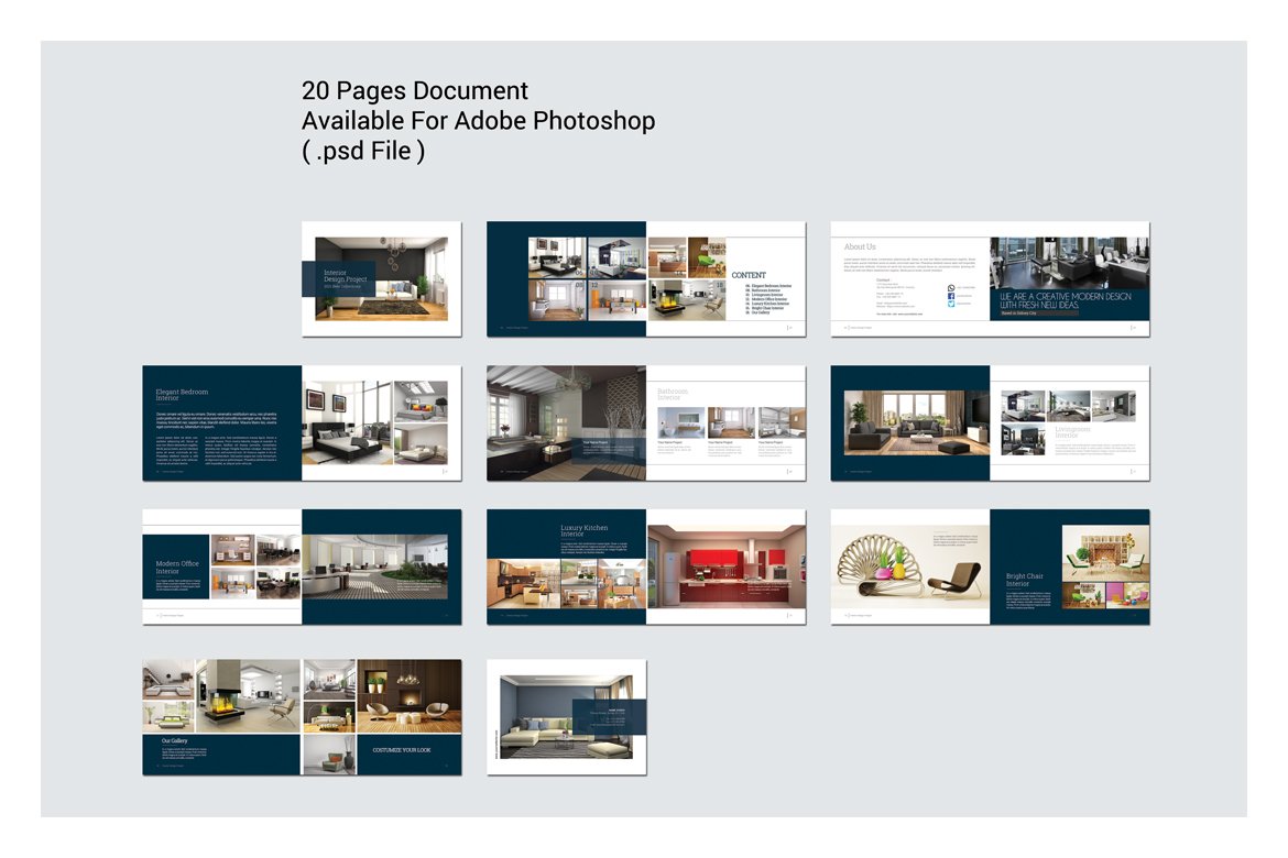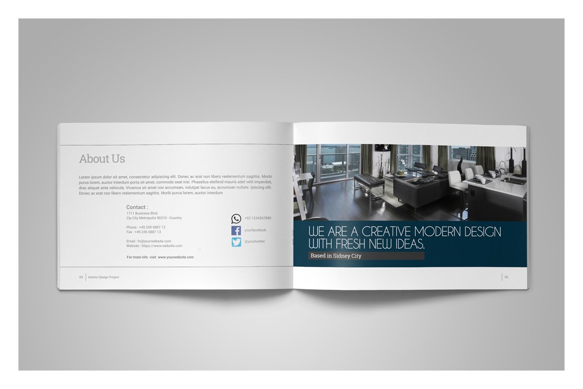 室内设计宣传册目录图册模板,只需放入您自己的图片和文字,即可进行打印。或将其用作专业的在线PDF或电子邮件附件。该宣传册模板可以用于多种目的。用它来展示您的照片,产品,服务-或其他您能想到的东西,图像将位于正面和中央。