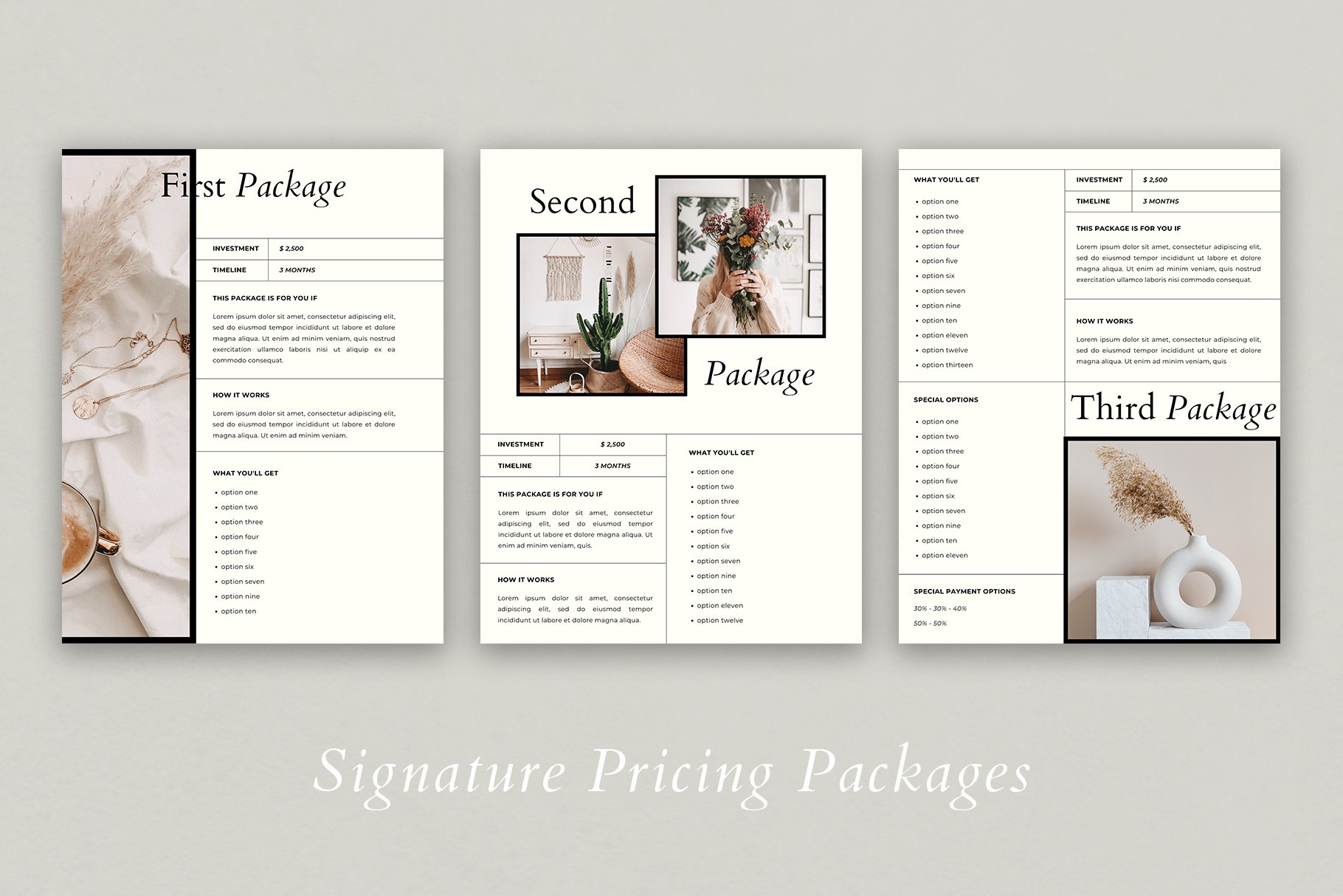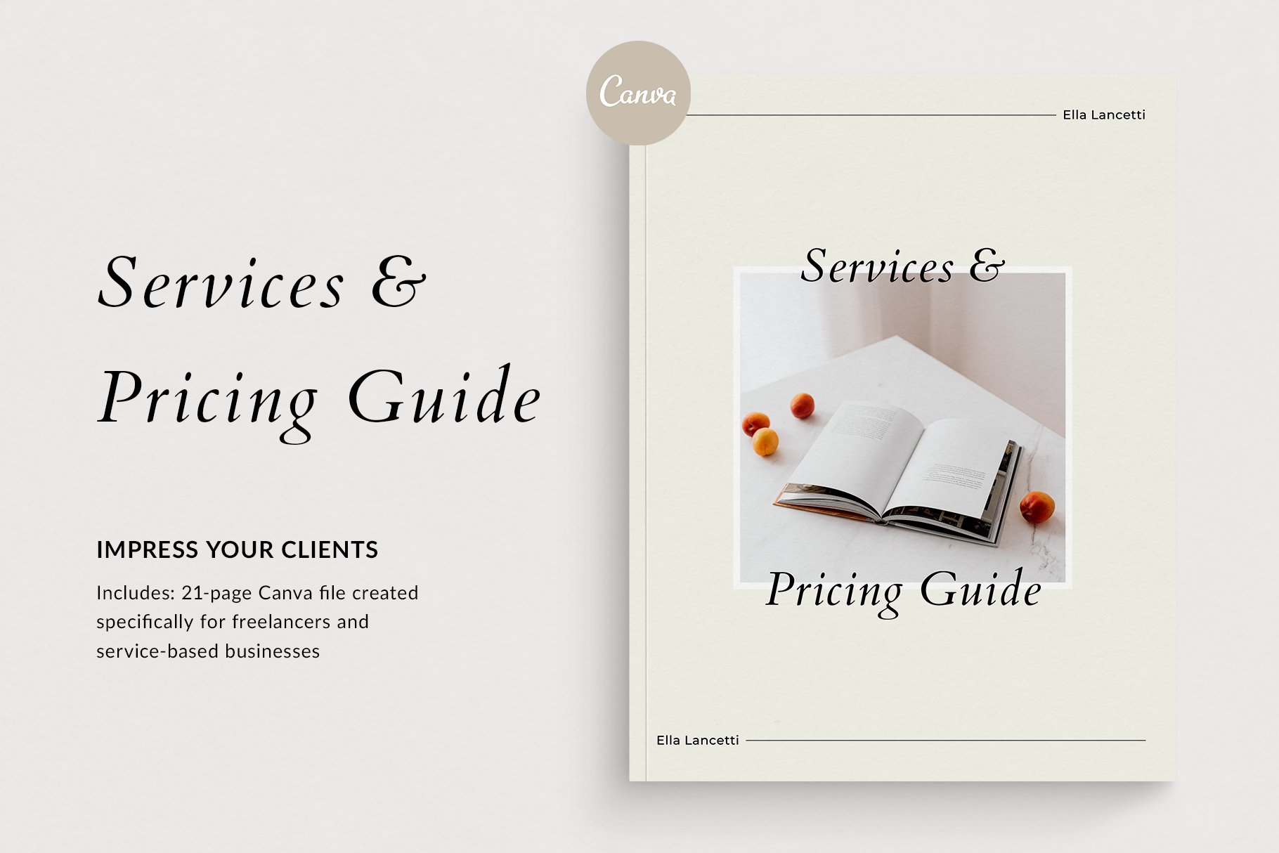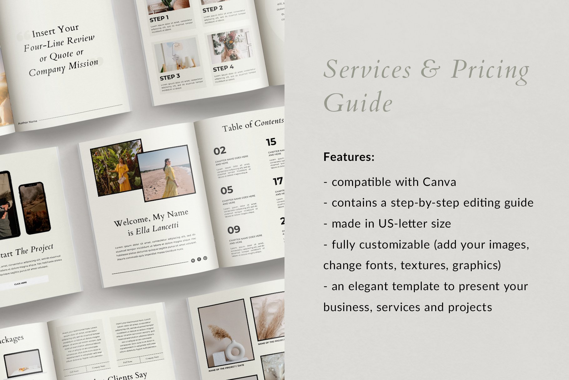 专门针对服务型企业,自由职业者和企业家制作的专业优雅的《服务与定价指南》,打动您的客户。21页的模板,以美国信纸尺寸提供。对于设计师,摄影师,教练,博客作者和所有希望以优质服务闻名的人来说,这是一个完美的解决方案。